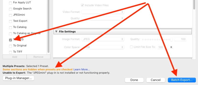 Beim Export von Fotos werden alle Einstellungen beim Anklicken von Presets (auch eigenen) ausgegraut. Ich kann dort nichts mehr verändern. Und nur „batch-Export“ aber nicht mehr „exportieren“.