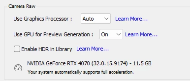Dedicated GPU memory used by Lightroom: 275,8MB / 12010,0MB (2%)
