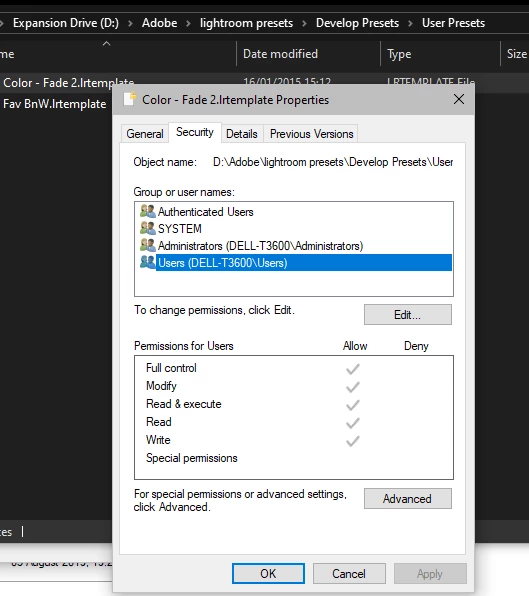 I installed LR CC and went to copy the contents of my backed up User Presets folder in to "C:\Users\User\AppData\Roaming\Adobe\Lightroom\Develop Presets" on my new machine. HOWEVER when i try and paste them in i get the error "You'll need to provide administrator permissions to copy this file", i click continue then get "You require permissions from DELL-T3600\USER(my current PCname and user account) to make changes to this file, i press Try again and it just keeps presenting the same error.