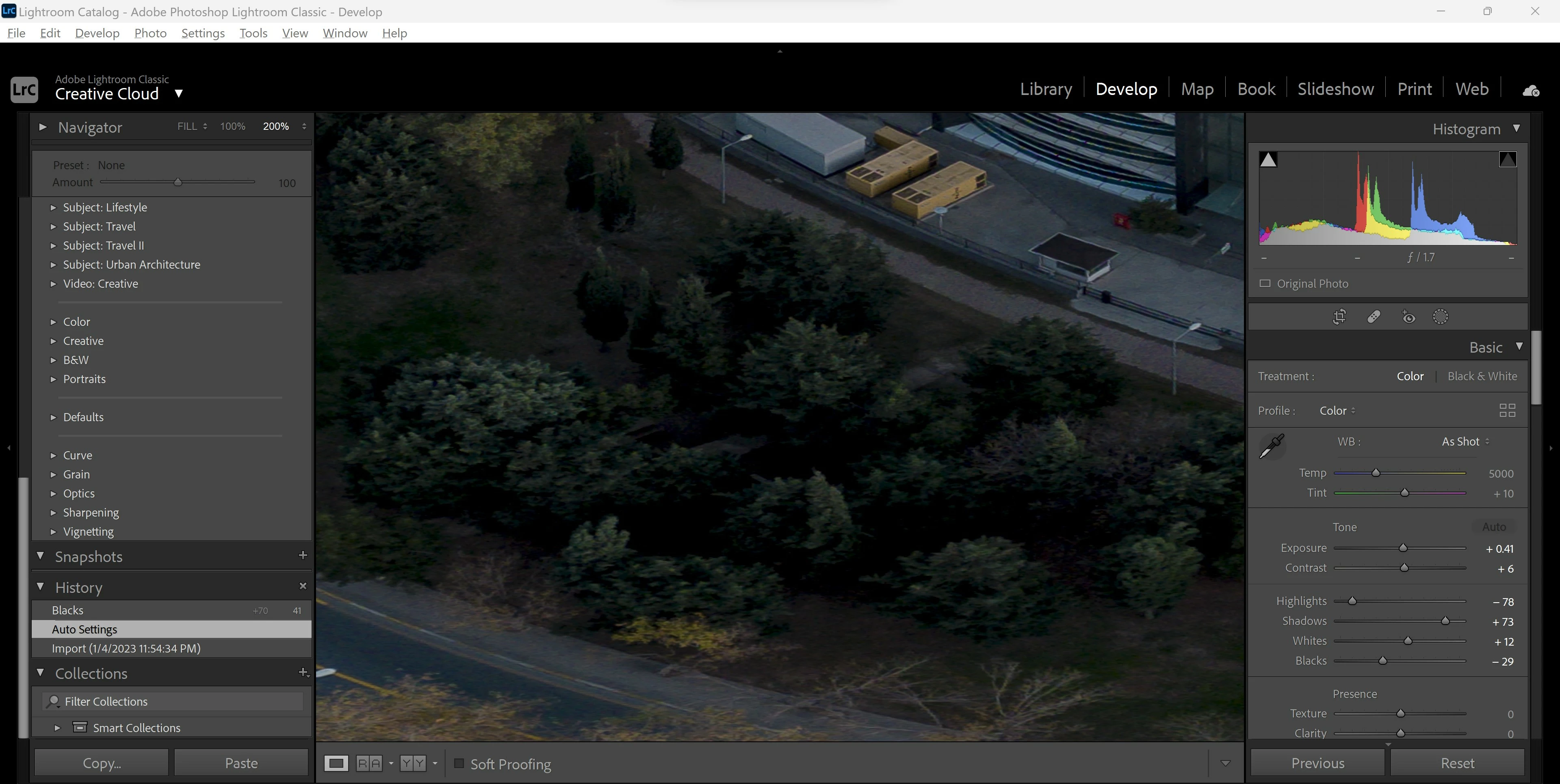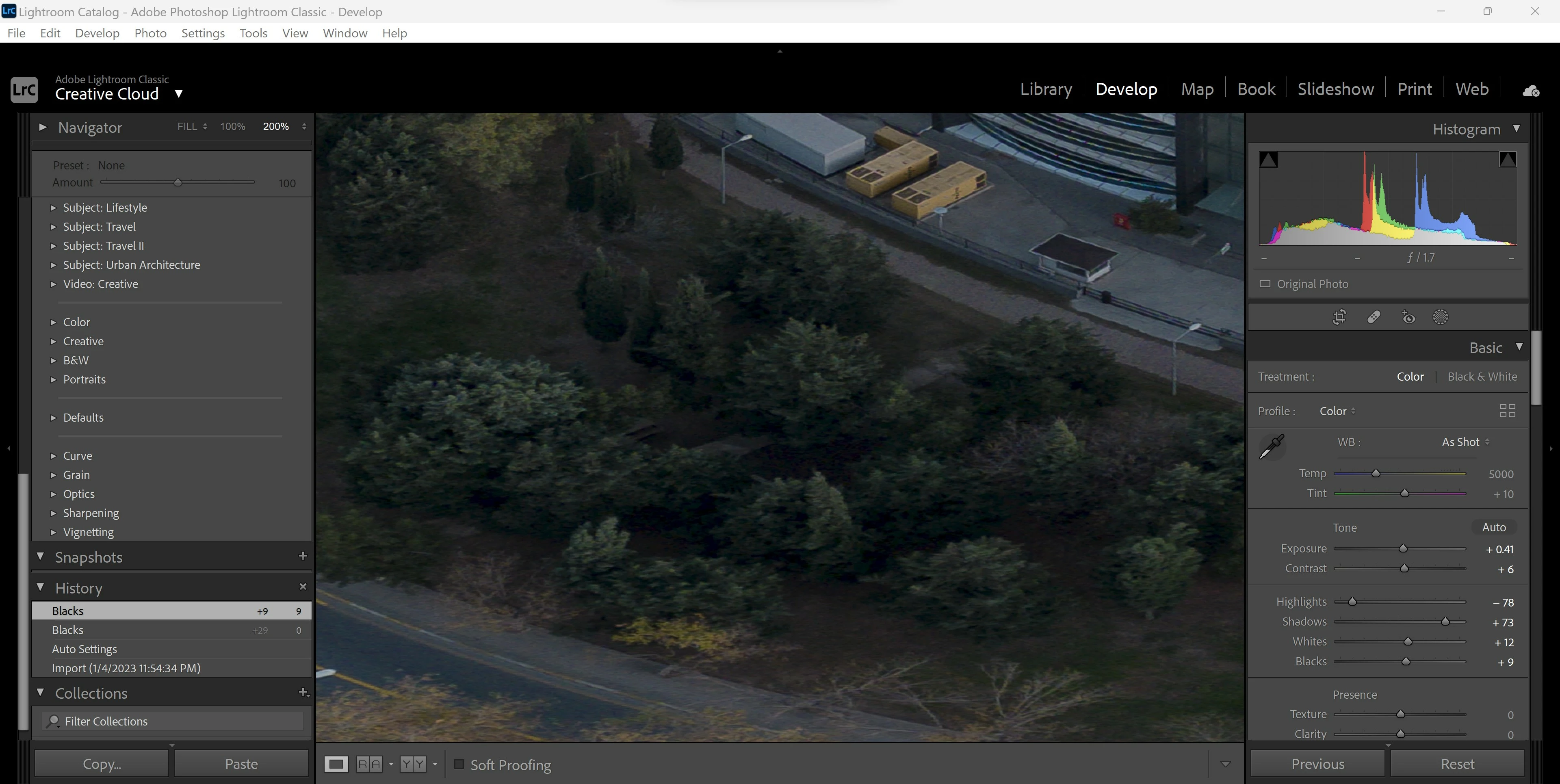 When I increase the Blacks globally I get details back within the shadows of the trees. But I don't want this Blacks adjustment to apply globally - I just want it in the tree area.
