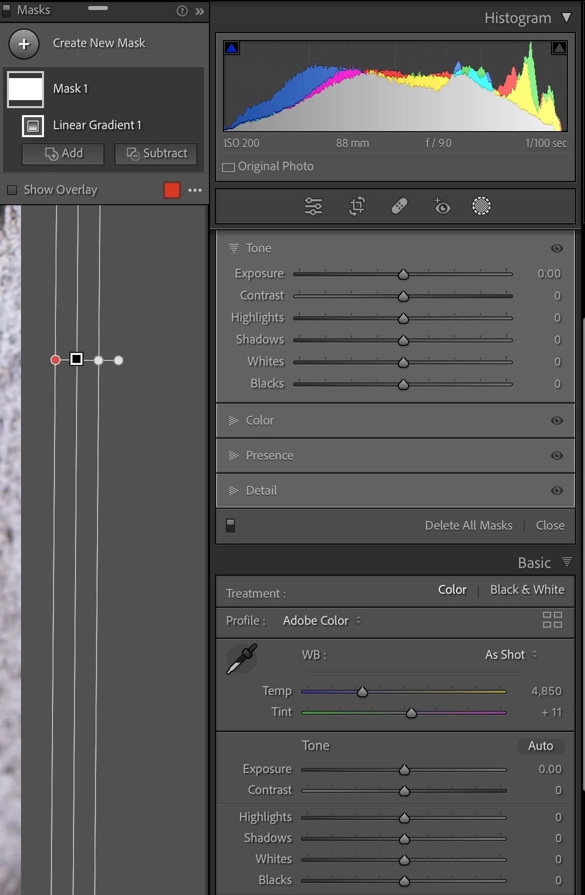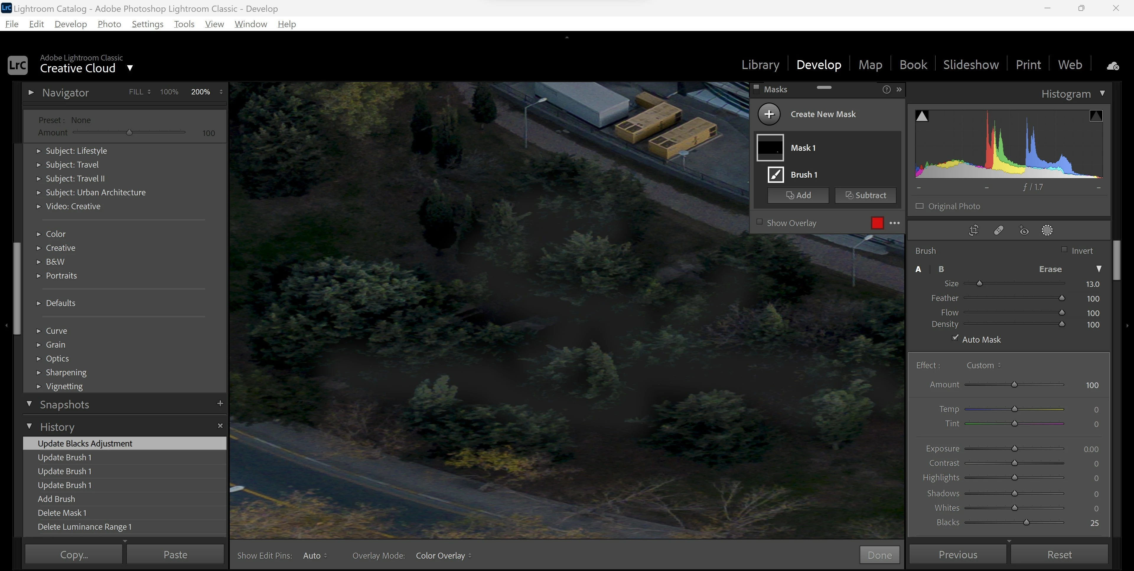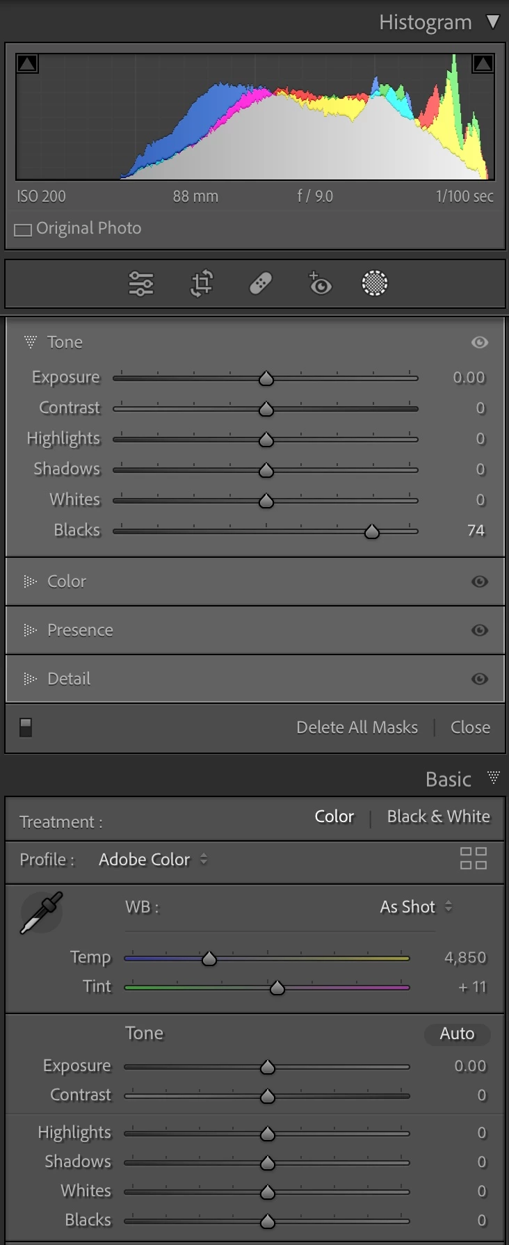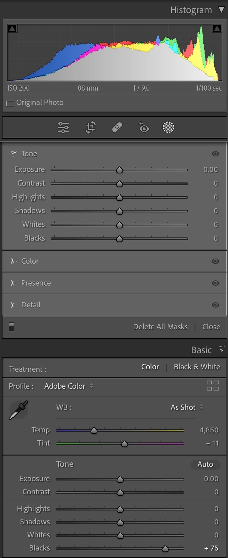 So I use an adjustment brush to mask just the trees, but the Blacks adjustment with a masking brush works *completely* differently to the Global Blacks adjustment. When I increase the Blacks with the masking brush it doesn't recover any details - all it seems to do is increase the black point.