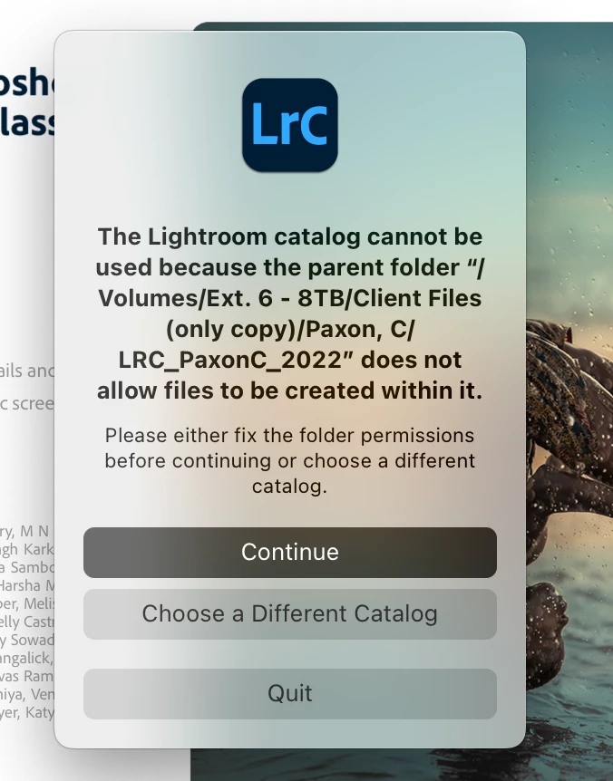 I am getting this error message. I thought maybe there was not enough memory on my external HD, so I tried to open a brand new catalog in a new external HD. I can't do anything, and I am panicking!