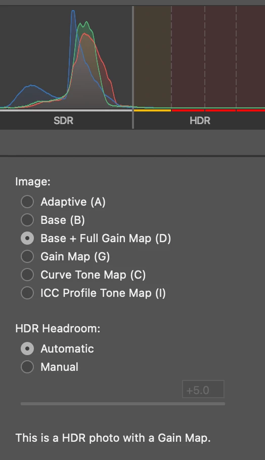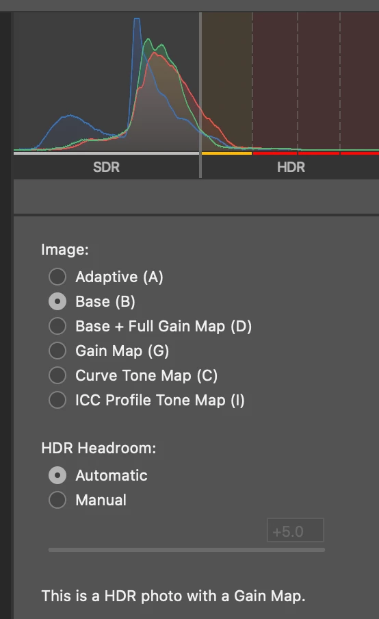 - It appears that the AVIF file is an SDR base plus gain map to get to HDR. I can verify this with how it's displayed in Apple software on various devices, and by comparing the SDR display rendition to what I specify in Lightroom. This is kind of what I'd expect—this is how a traditional JPG+gain map works.