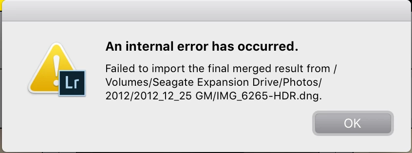 When I merge photos, I'm able to see an HDR preview. Then I hit merge, and it stops about halfway through and says "An internal error has occurred." I've tried uninstalling Lightroom and reinstalling it, but I'm still getting the same error. I've also tried several different bracketed photos. I'm using the same external hard drive with no problem on my old PC, but I keep getting this error on my new iMac. Please help!