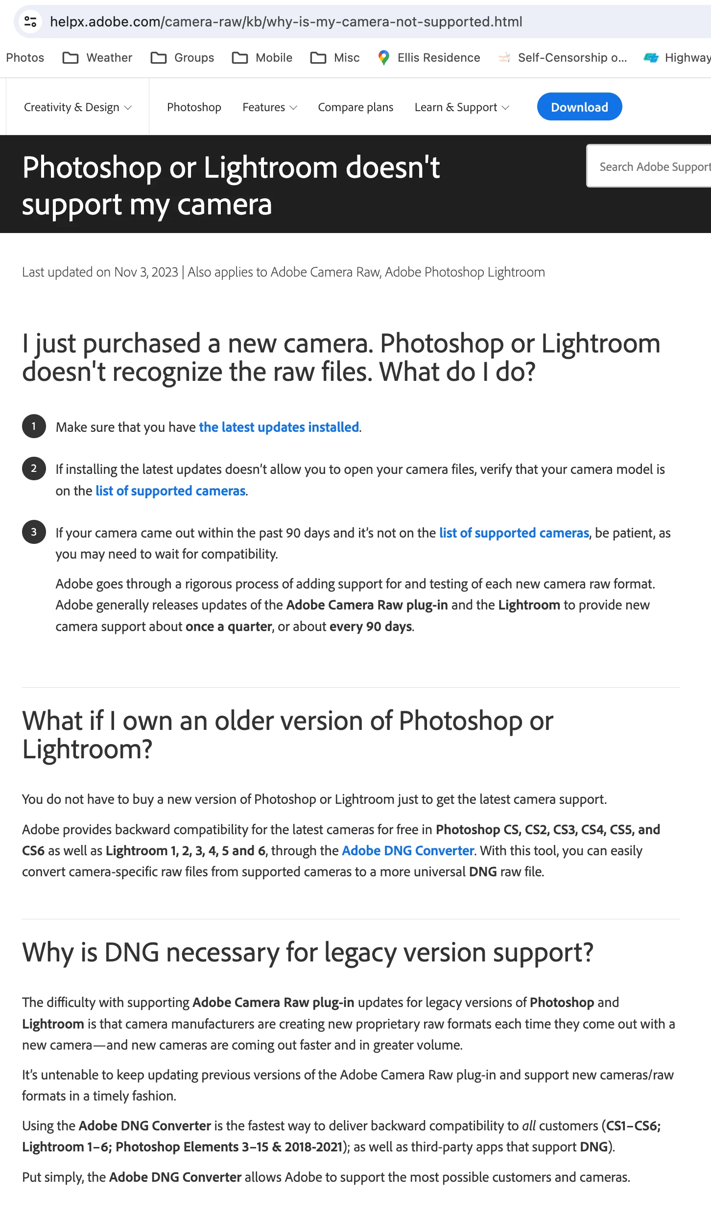 The help article Cameras supported by Camera Raw links to the article Photoshop or Lightroom doesn't support my camera, and though it claims to have been udpated Nov 3, 2023, it's way out-of-date: