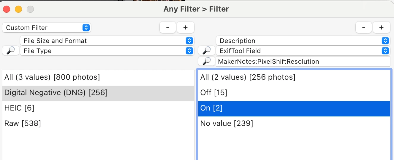 My problem is that I don't see any way to distinguish which images in my catalog are Pixel Shift, and which are not. I can filter by camera model and file format (I only shoot in DNG anyway), but that does not narrow it down enough.