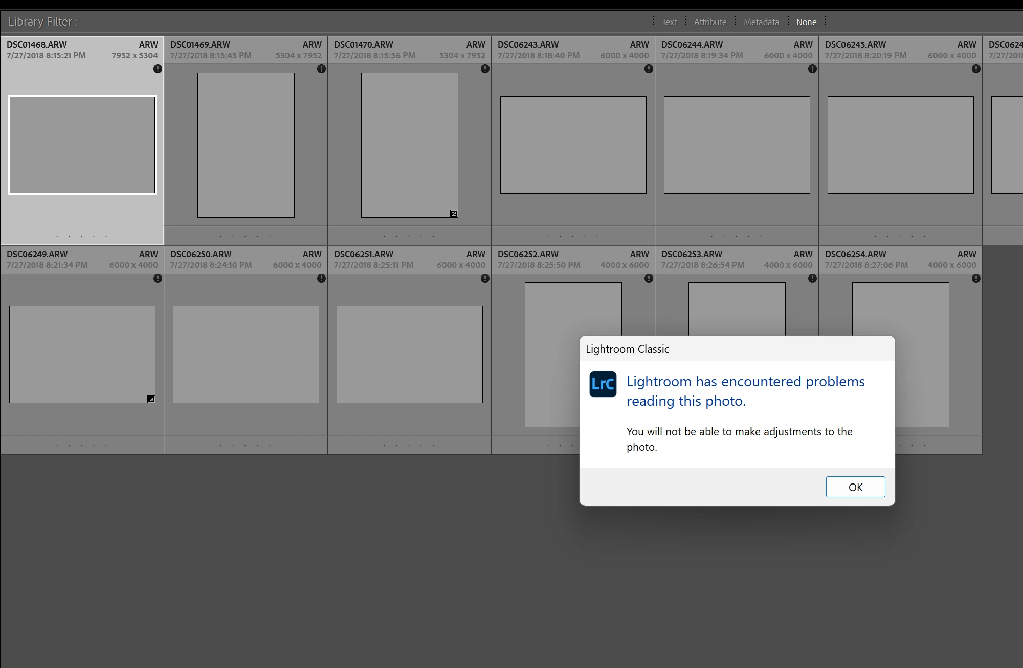 I have recently had a bad hard drive and many files were corrupted (100,000 +). When I view them in Lightroom they have a black "i" in the top right corner and a warning that LR can't read the file and won't be able to make adjustments. So I want to delete the files as they are now useless but taking up massive storage space. If LR can identify these files then I should be able to sort by them, select them and remove from catalog. They are all sprinkled randomly throughout a very large catalog and amny folders are filled with a random mix of corrupted files and good files together. How can I do this??