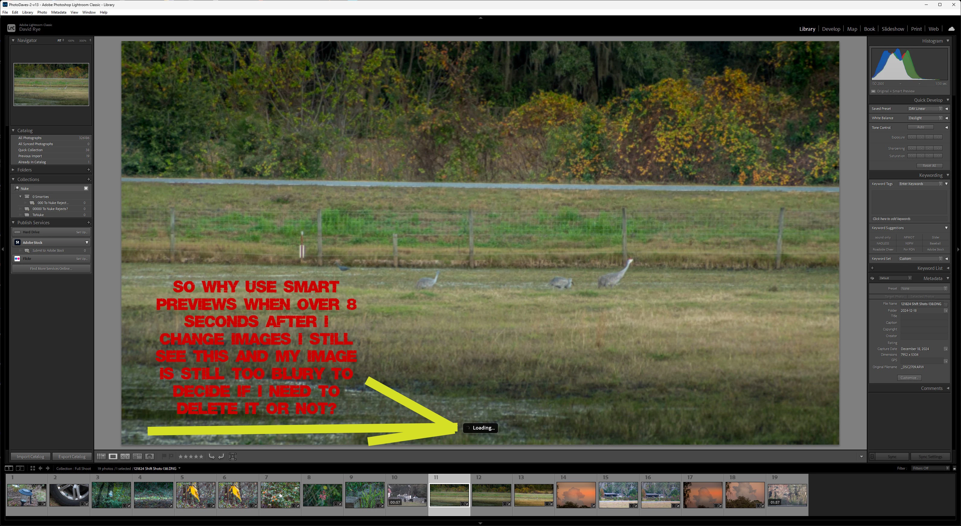 On Adobe LRC in Windows 11 every time I change the active photo it take > 8 seconds before it displays clearly on the screen no matter if I have standard or smart previews built already. This is cumbersome when I'm trying to browse through a full shoot (at least 200) of photos at the end of the day to decide which will be deleted and which is still worth editing. Why do I keep seeing this one the screen for so long after moving to the next item in the current collection? Is there any way around it so I can go on a quicker trip to try and weed out the shots not worth it? Thank you for any ideas.
