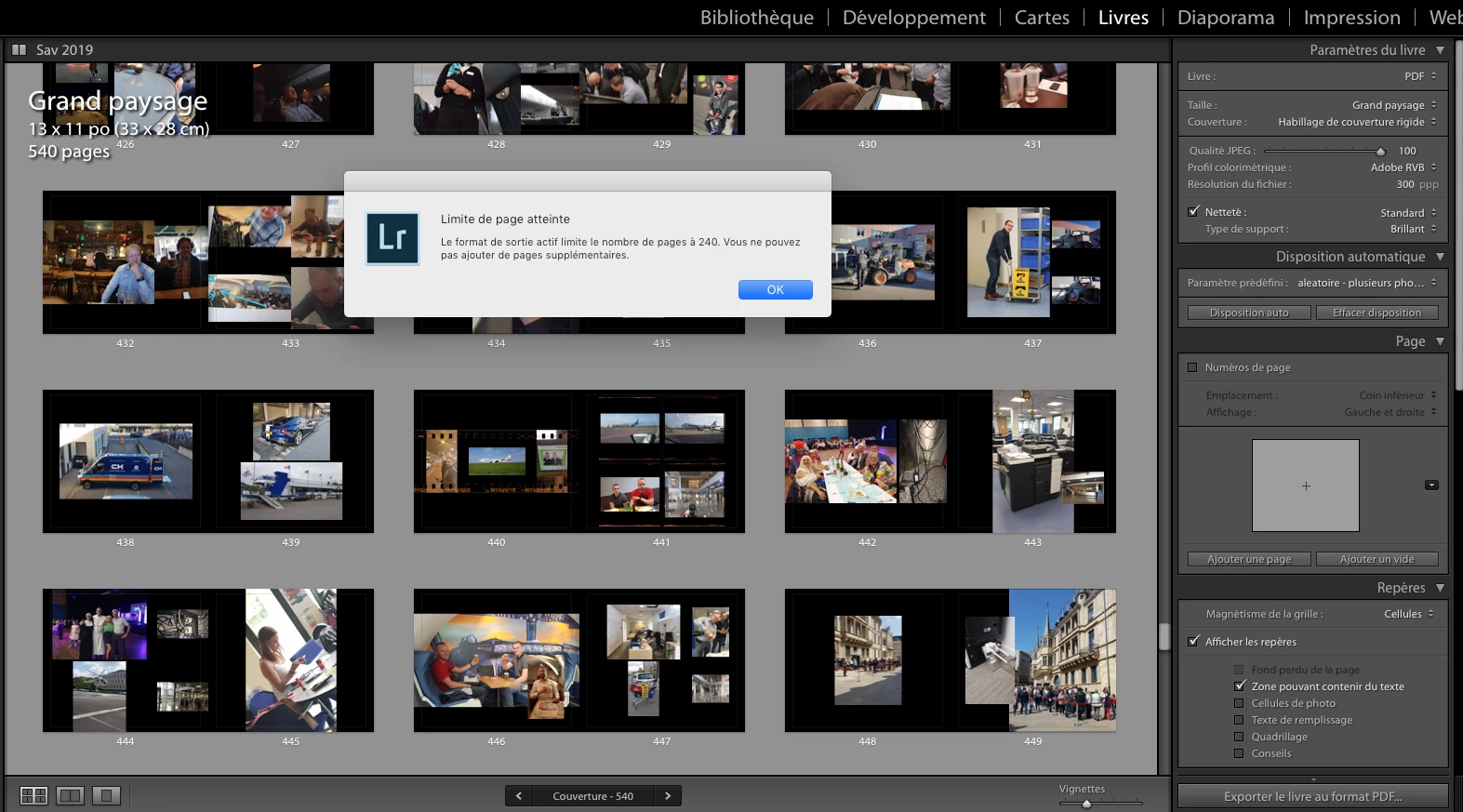 I' ve always this message : Limite de page atteinte. Le format de sortie actif limite le nombre de pages a 240. ( see on picture below)