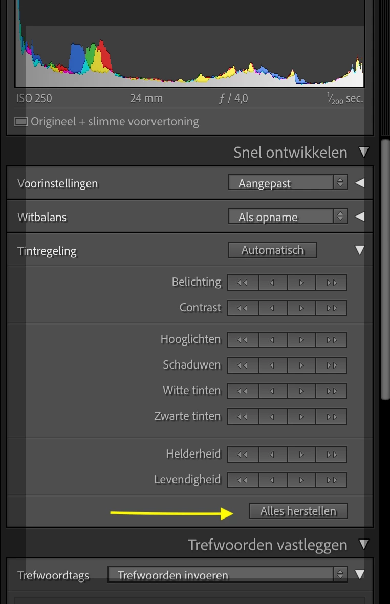 Unfortunately, in LR I still don't see the image/preview that I see on my Z9, the automatic adjustments continue to happen. However, in the library module (with 'fast development') I can set all settings to 0 by clicking 'restore all' (cfr screenshot/yellow arrow). All the automatic adjustments made by LR are now undone and all the settings are on 0 (and this is actually the initial situation I want) .