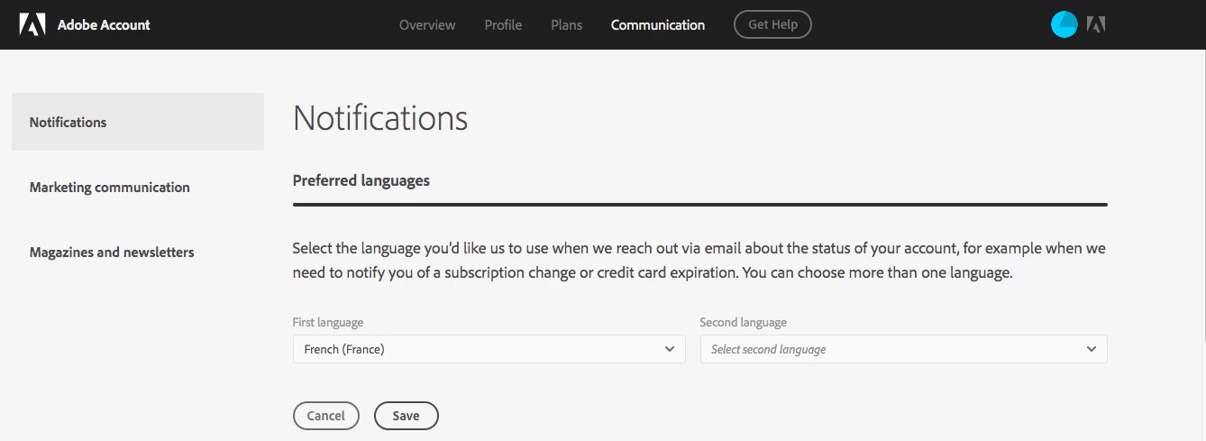I get my emails from Adobe/ Lightroom in French. Although I am staying in France during periods, I speak the language poorly. How can I change the languish?