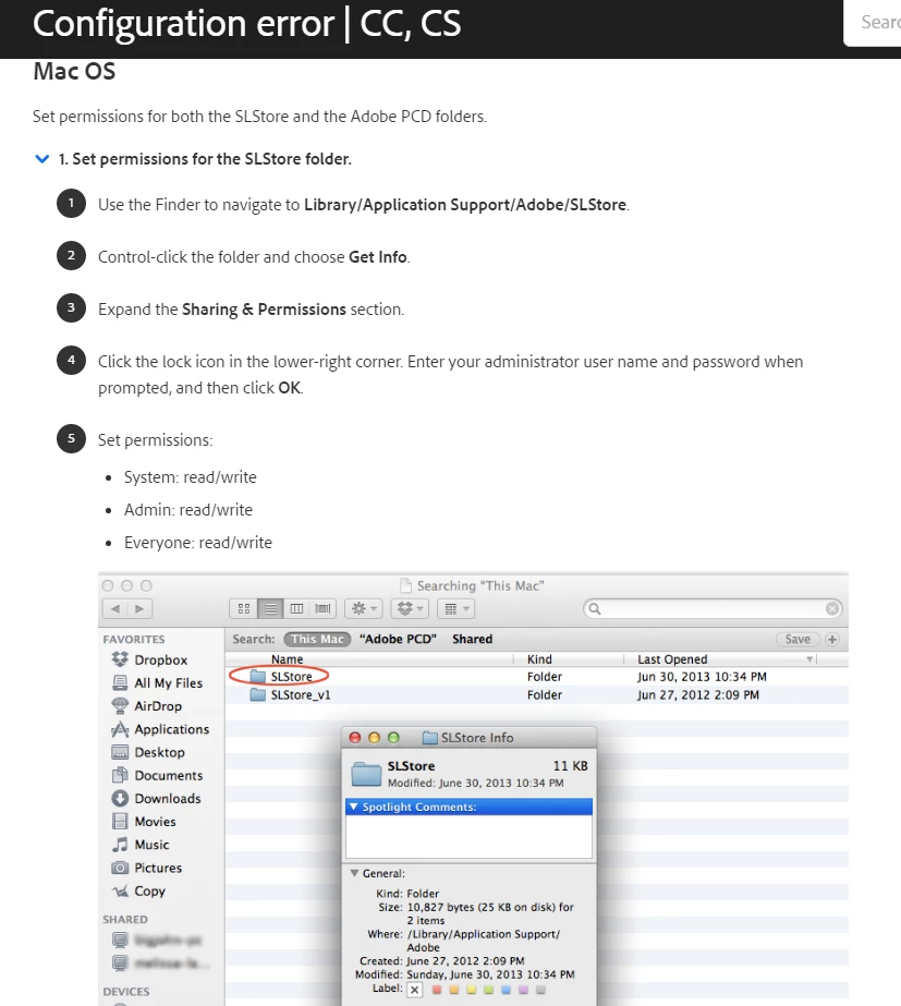 I tried this but don't see SL Store or Adobe PCD files. I do have Adobe Lightroom 5.71 AMT and Lightroom folders, and i changed permissions on all those and still get the same error message.