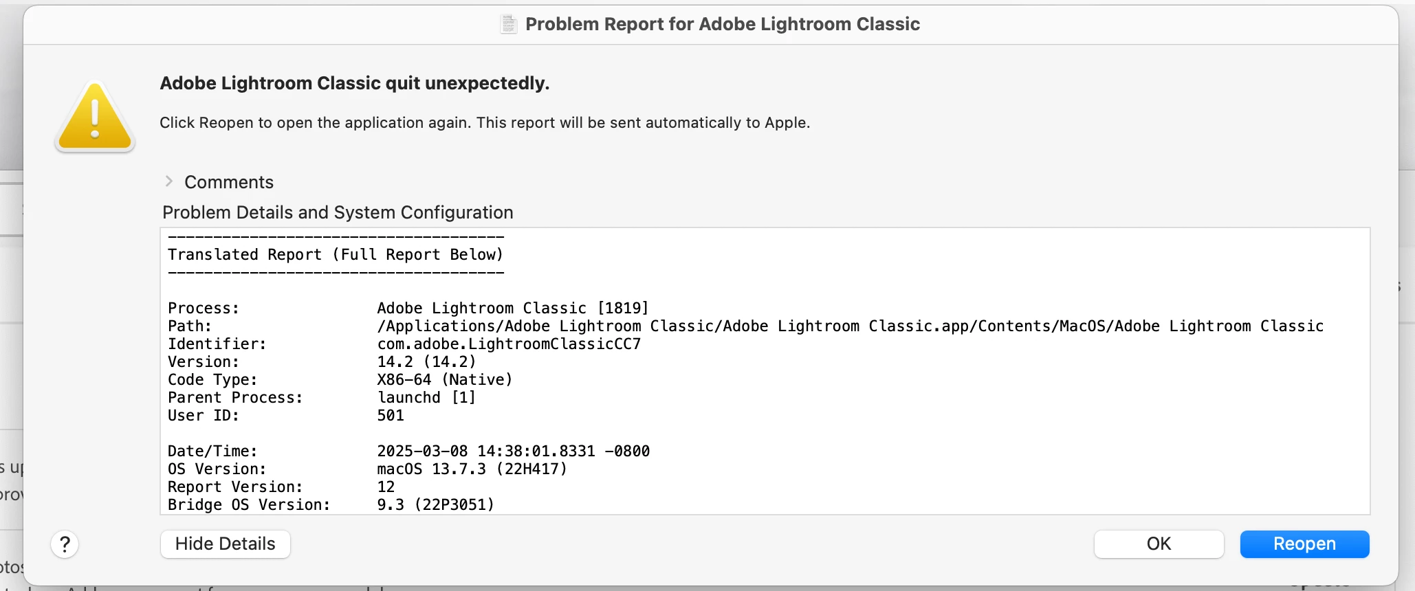 Aleke, Thank you for your reply. I updated to Sequoia and that solved the problem with Lightroom Classic.