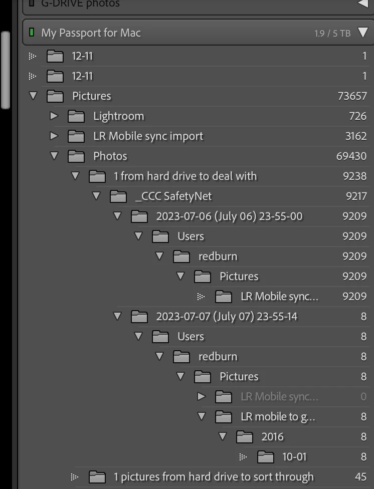 So then I went to the folder (in LR) with 9207 photos that was created from the safety net from a Carbon Copy Cloner backup, which I'd moved (in LR) into the external hard drive to go through, thinking I'd be able to identify ones from a particular month and move them to the proper folder (with the rest of the photos from that month), but when I try moving them in LR, I get an error message. I've never had trouble moving before, and it's not telling me that they're already there, just that they can't be moved. Don't know if it's cause they're from a safety net from backing up or cause they've turned into On1 (see below)