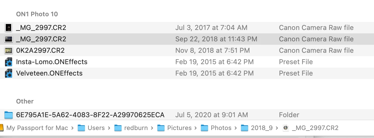 I just tried moving one of the many files (that I've edited in LR and was in my catalog til this mess) that's still on the IMac to the 2018_9 folder on the external (My Passport drive). The image still does not appear in the 2018_9 folder in the LR catalog. When I search for it, it shows that it's in On1 Photo in that folder. I checked and this seems to be the pattern with many of the images that I'm trying to make accessible in lightroom. I've never used On1. How do I get photos out of On1 and back into LR?