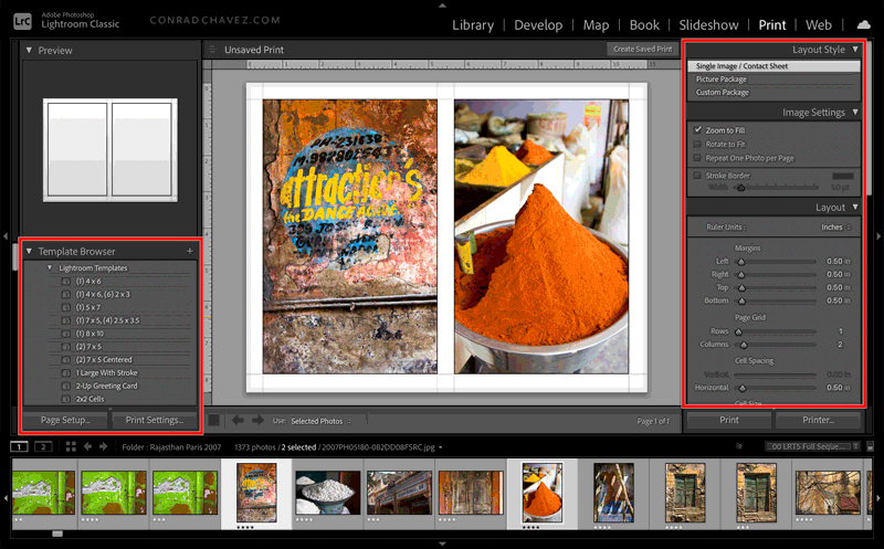 The Print module in Lightroom Classic lets you create multiple cells per page. The photos you select in the filmstrip or grid will fill the cells. You can use the options in the right column to adjust cell size, spacing, and page margins.