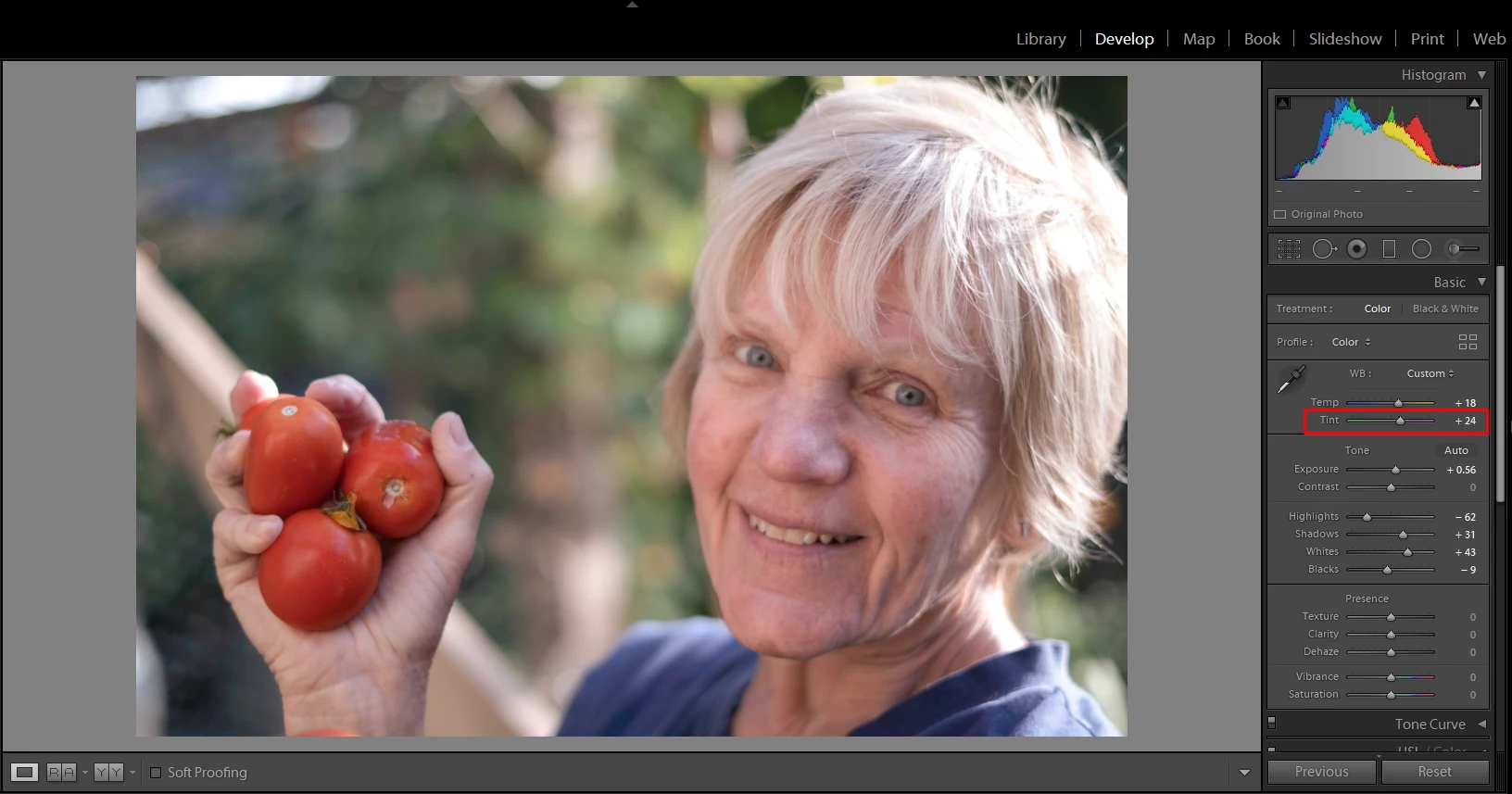 • To adjust this, you can move the Tint slider, available under the temperature slider to the left or right to remove the cast. This helps achieve more neutral colors in the image.