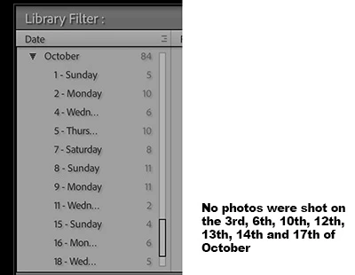 I am working on a Photo-a-Day project and have recently noticed that my numbers aren't adding up. I currently only have 318 photos, when I should have 324. Is there a way to ask Lightroom to show me dates where I had no photos added to the catalogue?
