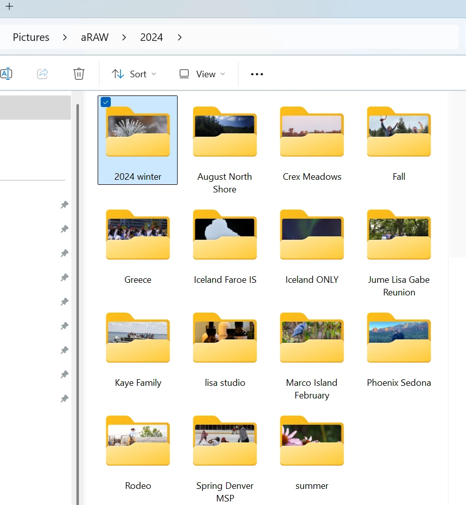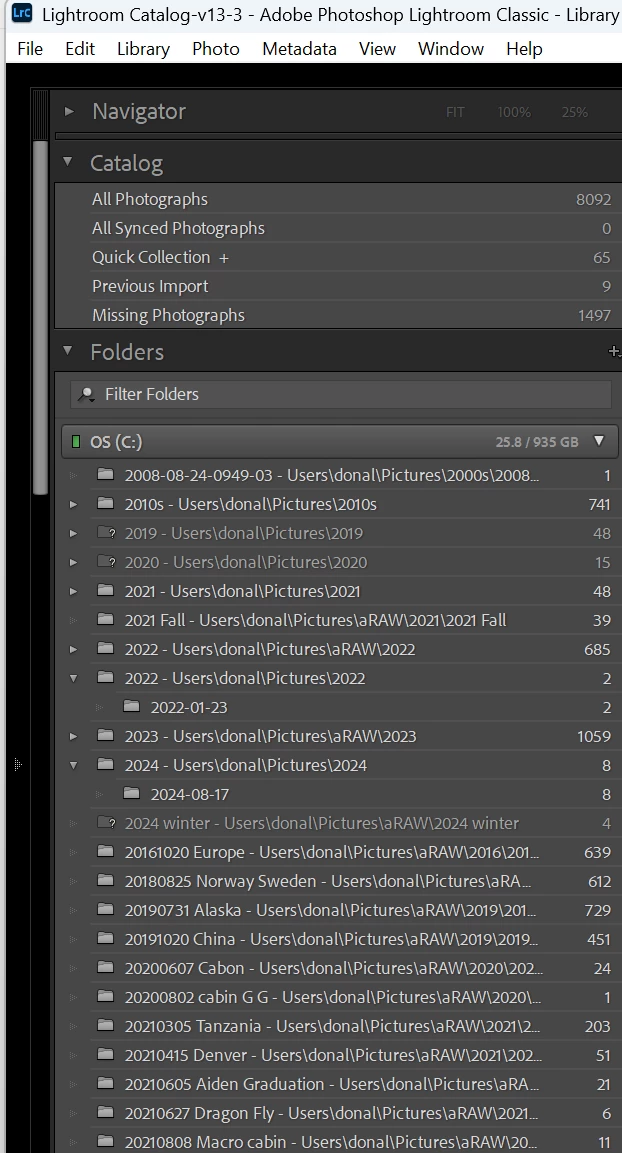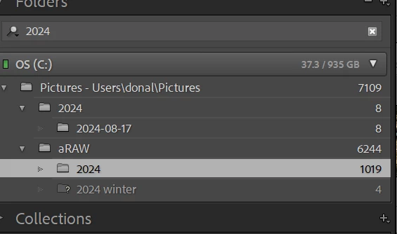 I have 11 years of photos in my main Lightroom catalog. On my harddrive, the photos are put into folders by year taken, and then a folder for each "shoot". I am unable to find (for example) photos taken in 2024. You can see a snapwhot of my catalog. Filtering by 2024 does not work. I don't understand the order of folders displayed or how to manage it.