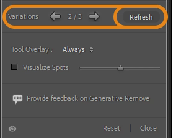 Lightroom Classic would now, using FireFly, develop three variations to choose from. You can click Refresh to develop three new variations. You can provide feedback on Generative Remove.