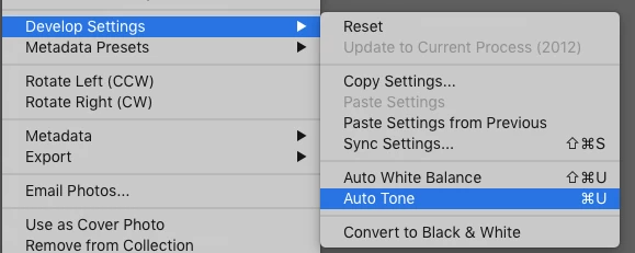 How can I use Develop/Tone/Auto on multiple photos at once?