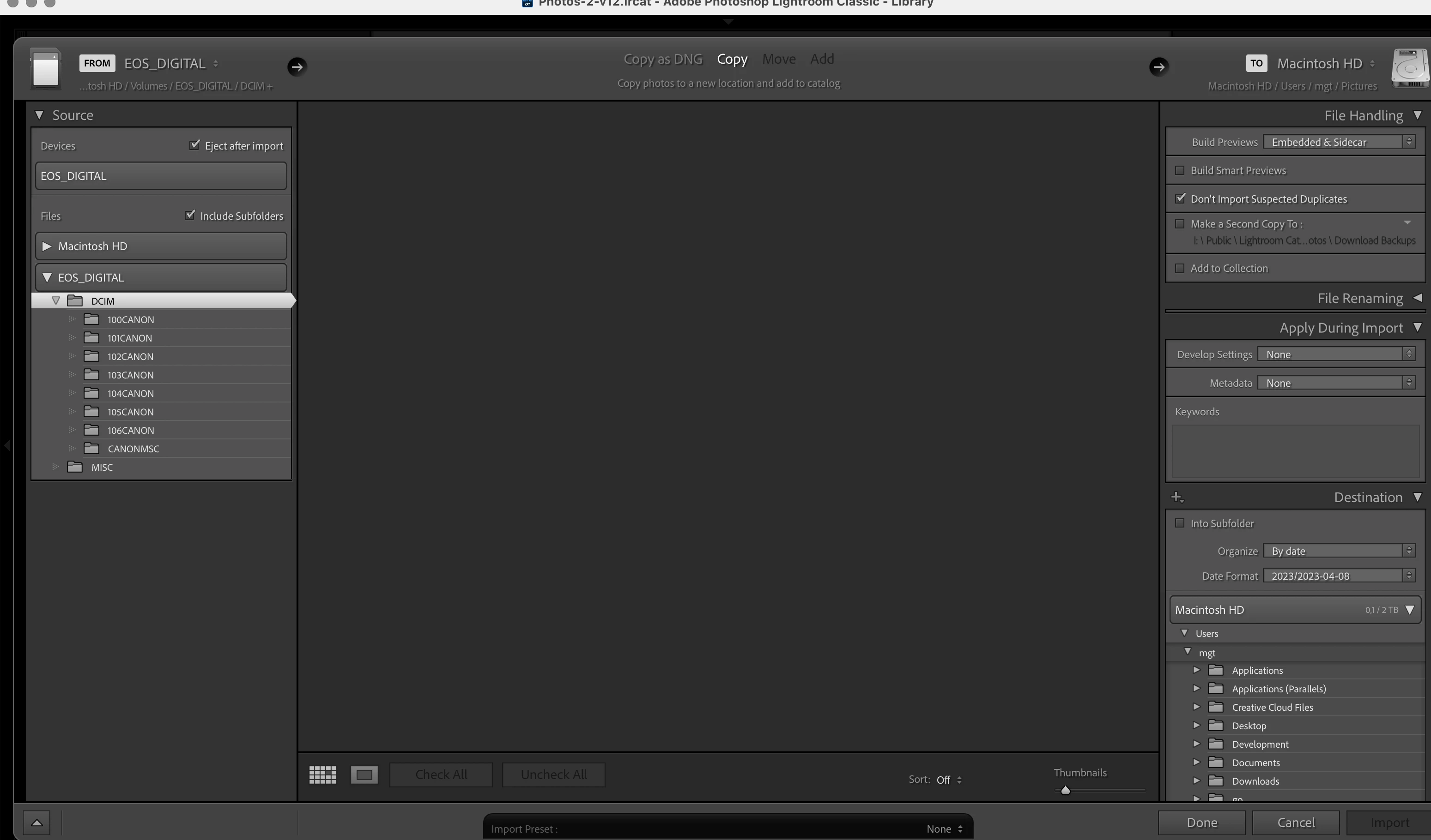 Sadly no matter what I do the Import Dialog shows no thumbnails anymore. Suffice it to say there are CR3 files (like always) on the folders.