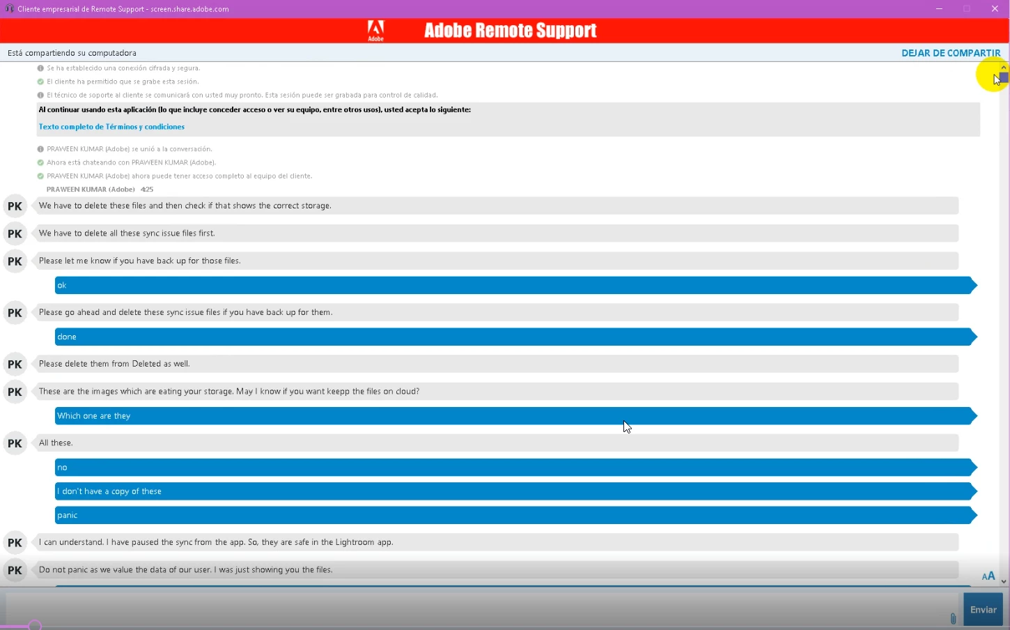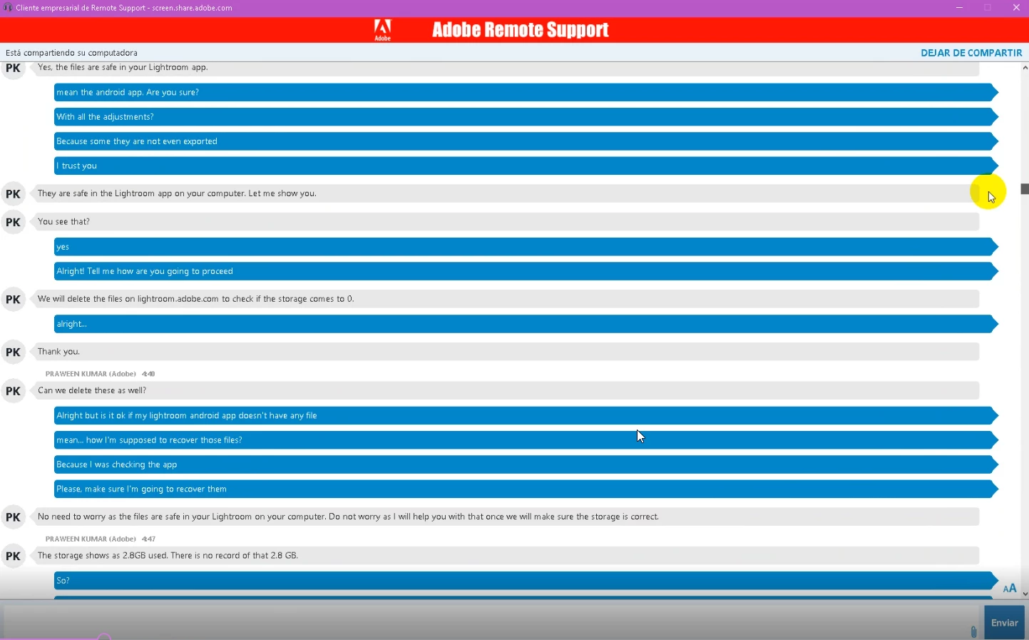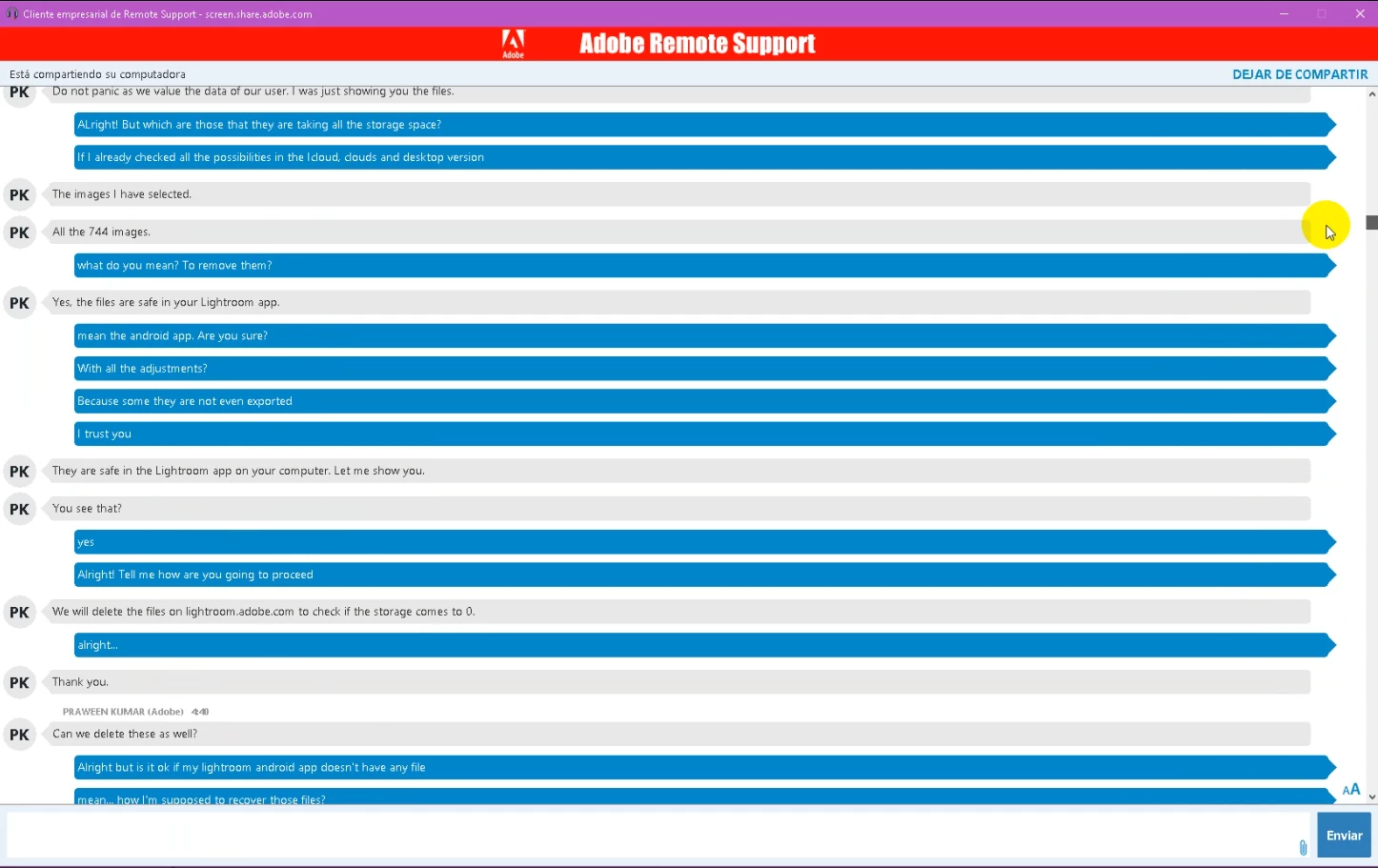 Hello! As I said I had a Lightroom storage issue. I was removing files for so many weeks to manage the space for new works and I always had a notification of little space to pay for more so I opened a case with the Adobe Lightroom tech team to see what was happening so the technical agent that checked the case and has suggested me to download the Adobe Remote Support program to control remotely my pc.