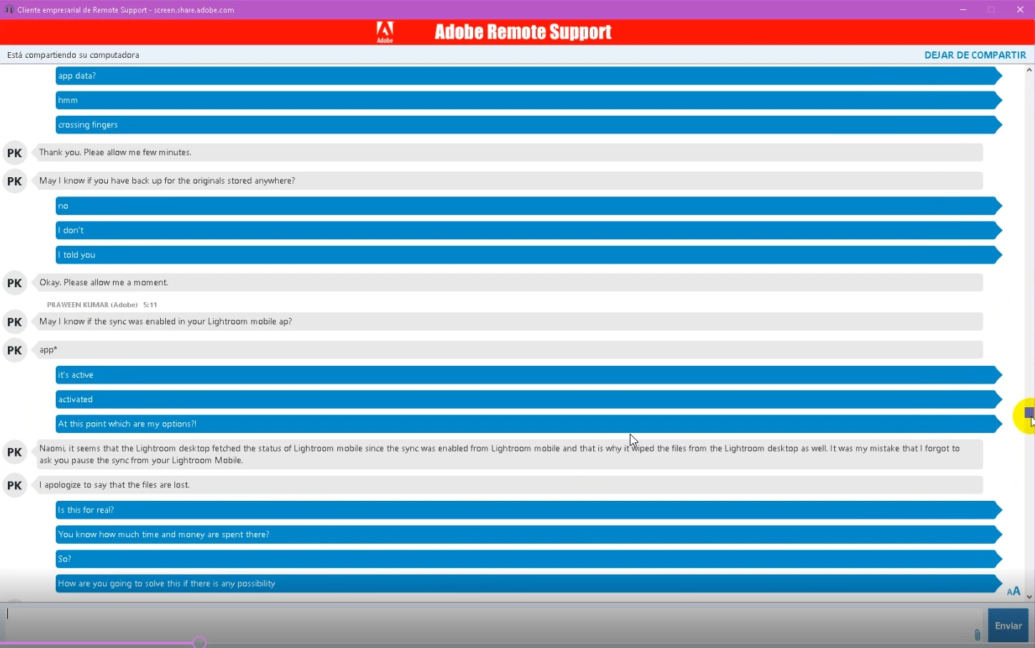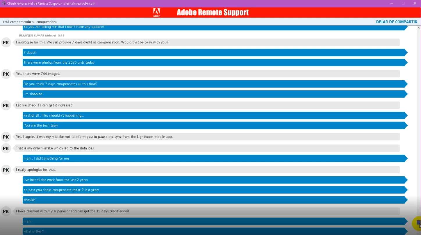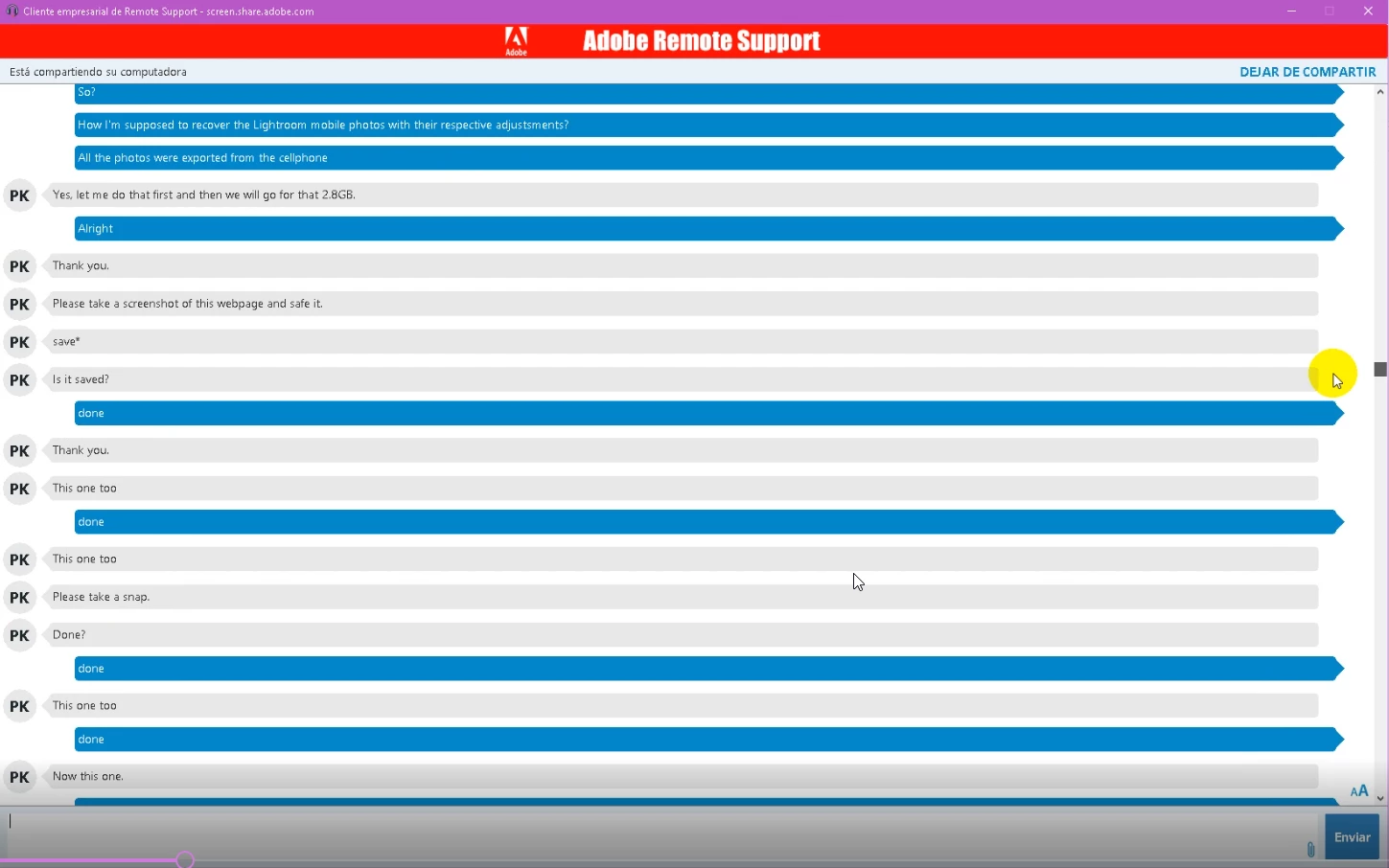 Hello! As I said I had a Lightroom storage issue. I was removing files for so many weeks to manage the space for new works and I always had a notification of little space to pay for more so I opened a case with the Adobe Lightroom tech team to see what was happening so the technical agent that checked the case and has suggested me to download the Adobe Remote Support program to control remotely my pc.