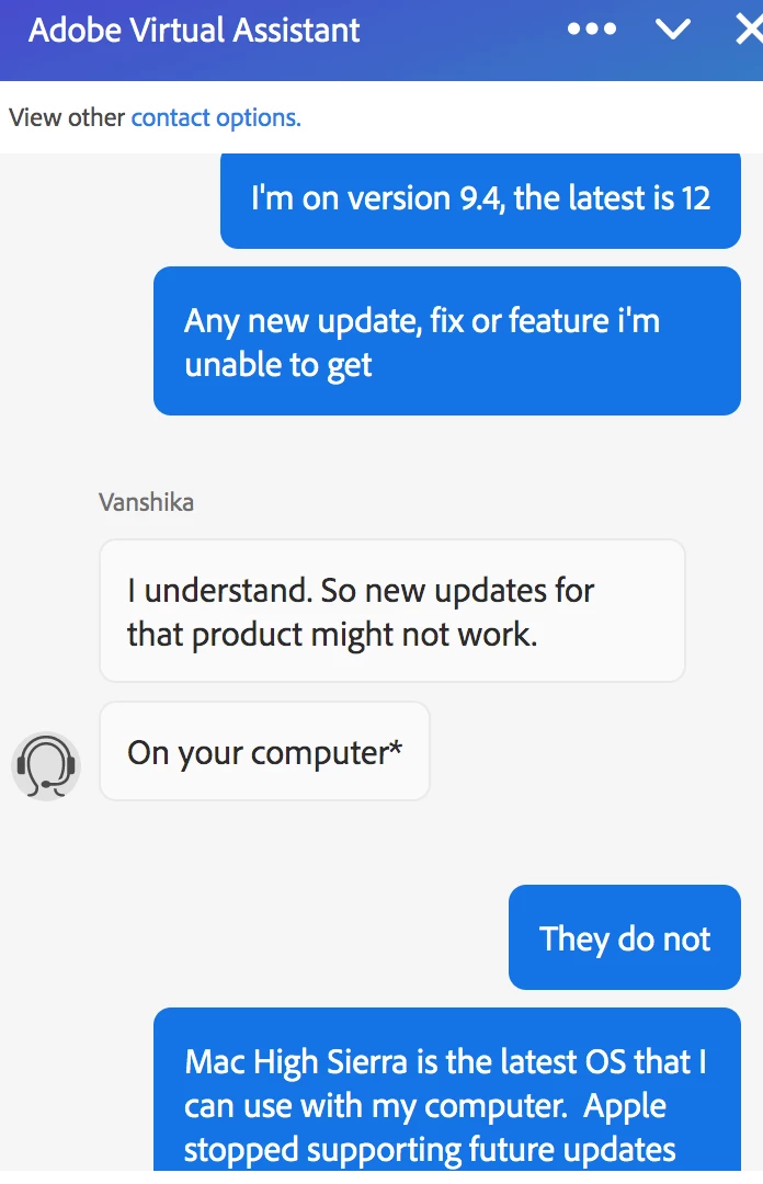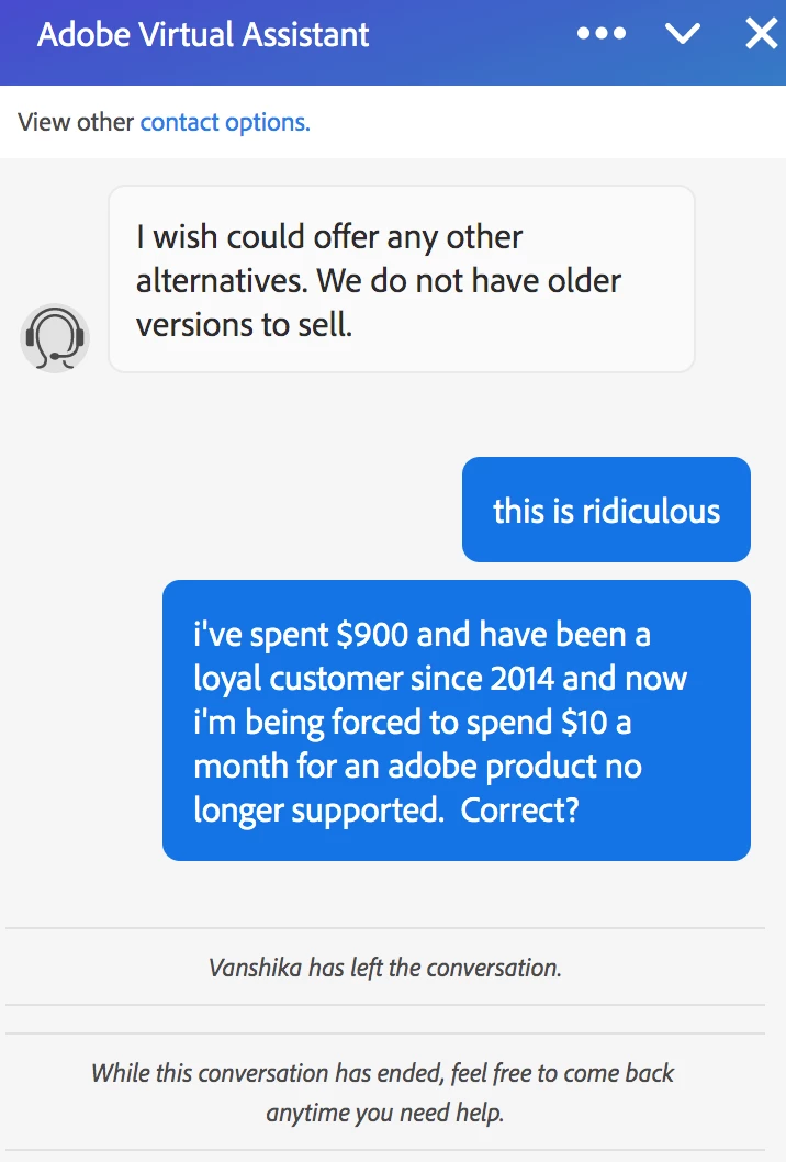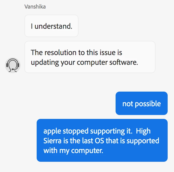 Is anyone else in a situation where you have an "old" mac that can't be updated past High Sierra, thus is no longer supported by adobe past lightroom version 9.4? I've been paying a $10 a month fee for lightroom that is no longer supported. I contacted adobe support and they told me that I would no longer have to pay the monthly fee and that I could use the old version in perpetuity. However, after doing so I became locked out of the development module. I contacted customer support (Vanshika) and they said that the previous person lied to me and that the only way I could continue using the unsupported version was that I pay them $10 a month. Halfway through the conversation Vanshika literally left the conversation.