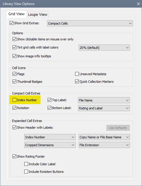 I have successfully downloaded LrC to a new Windows 11 computer and I have set all my preferences the way I want them except for one thing. I set preferences (View>Options) so that the file name appears in the upper left of each image in Loupe and Grid in the Library Module. But I cannot see where I can turn off the default gray numer on the left side of the image. Where is that set?