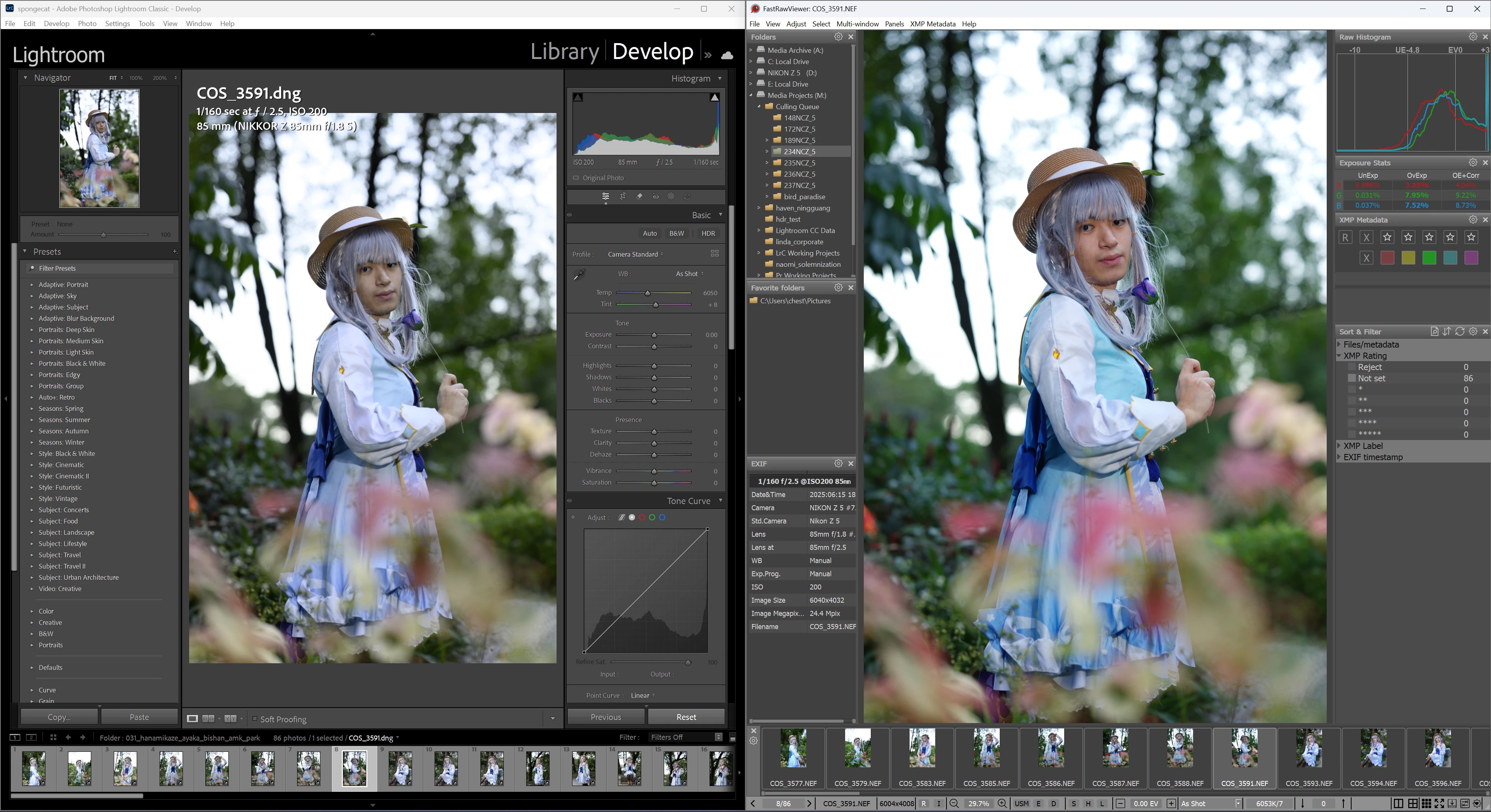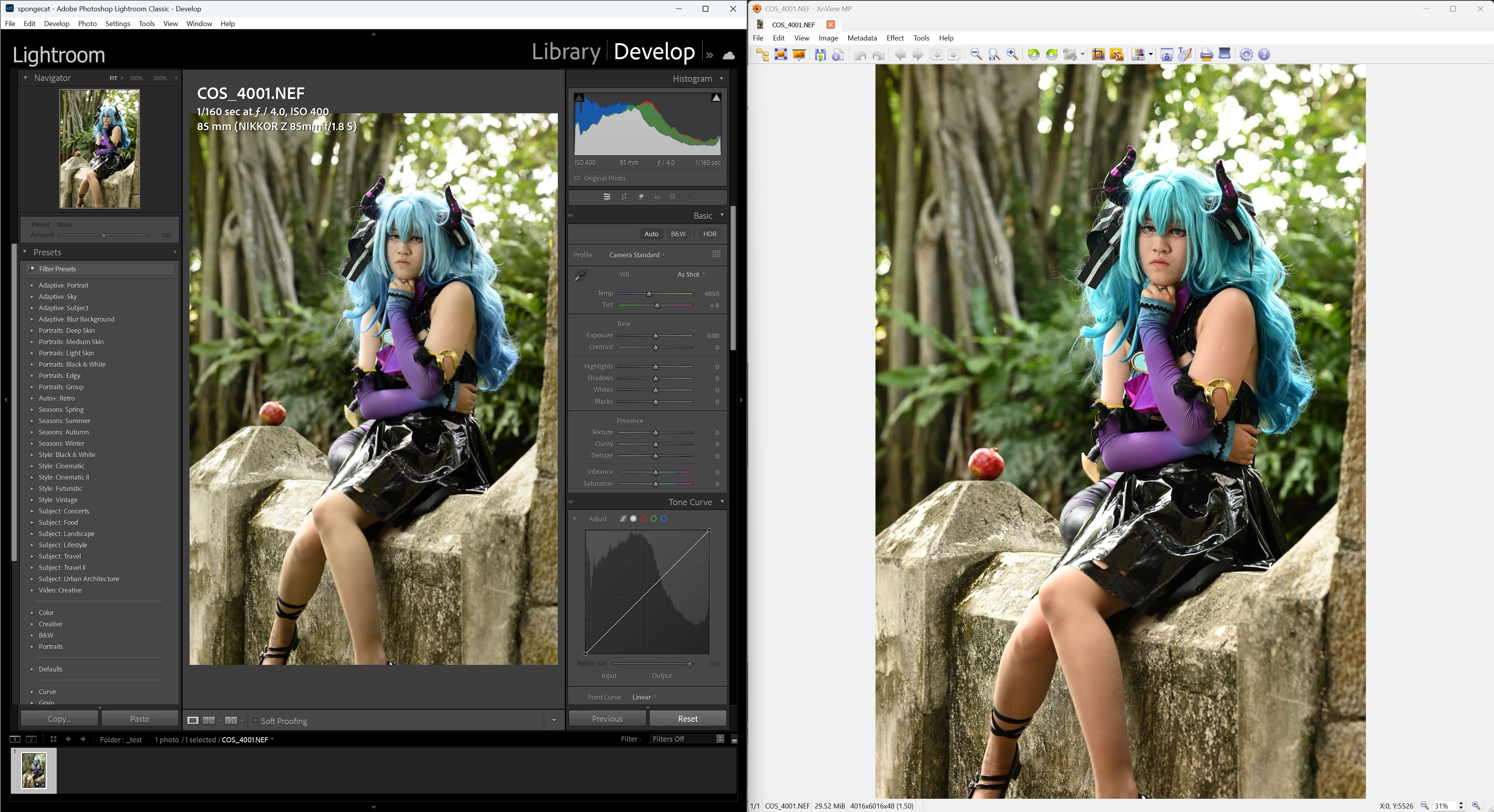 Look at the colours again. No matter what profile you select, Adobe Color or Camera Standard, the colors still look very washed out. Does not happen in other programs. Attached screenshot of Lightroom versus XnViewMP. Another screenshot shows an even more drastic difference in another image, compared to FastRawViewer using their own rendering engine.