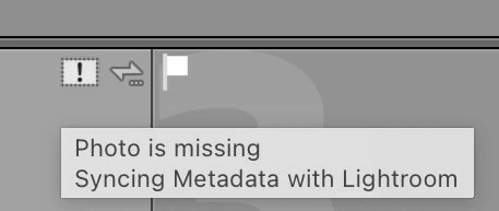 I have a few images from a photo shoot that have an exclamation point in the upper-right corner in Library view. When I mouse-over it, it says: Photo is missing. Synching Metadata with Lightroom.
