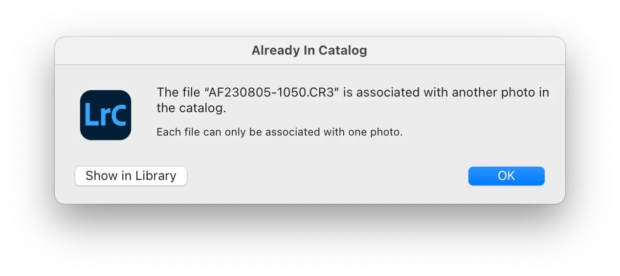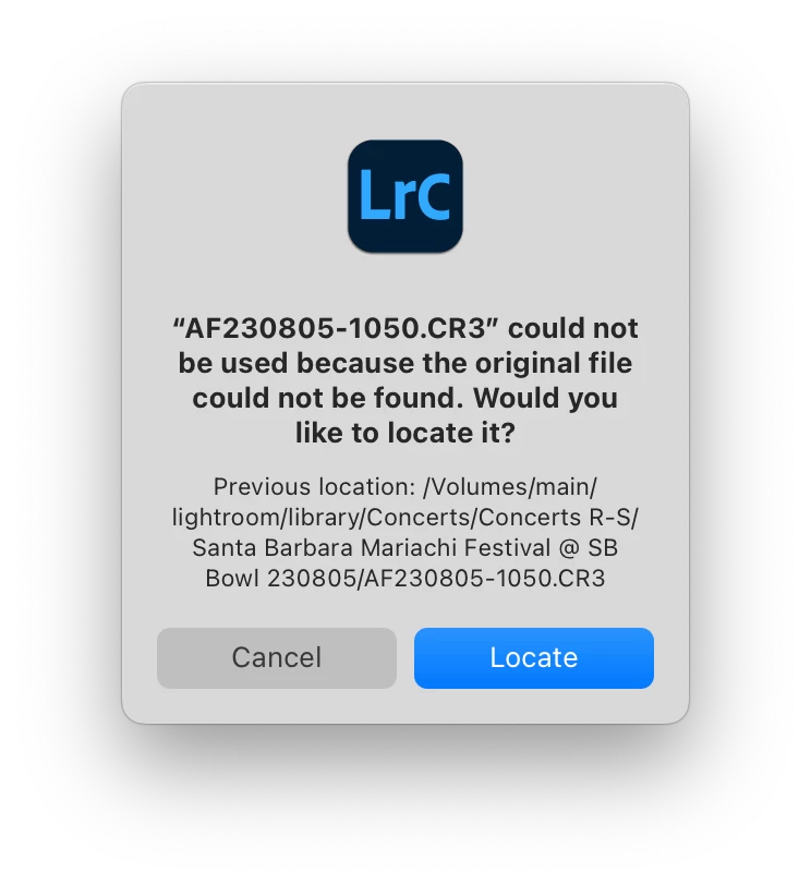 Although I cannot export it, If I right-click the photo and select "Show in Finder," a Finder window popus open with the correct RAW file selected. If I click the Lightroom Classic "!" icon on the image, I'm told that the file could not be used becuase the originial file could not be found, and I'm asked if I want to locate it. If I locate the file, I'm told that it's already in the catalog, so it can't be used.