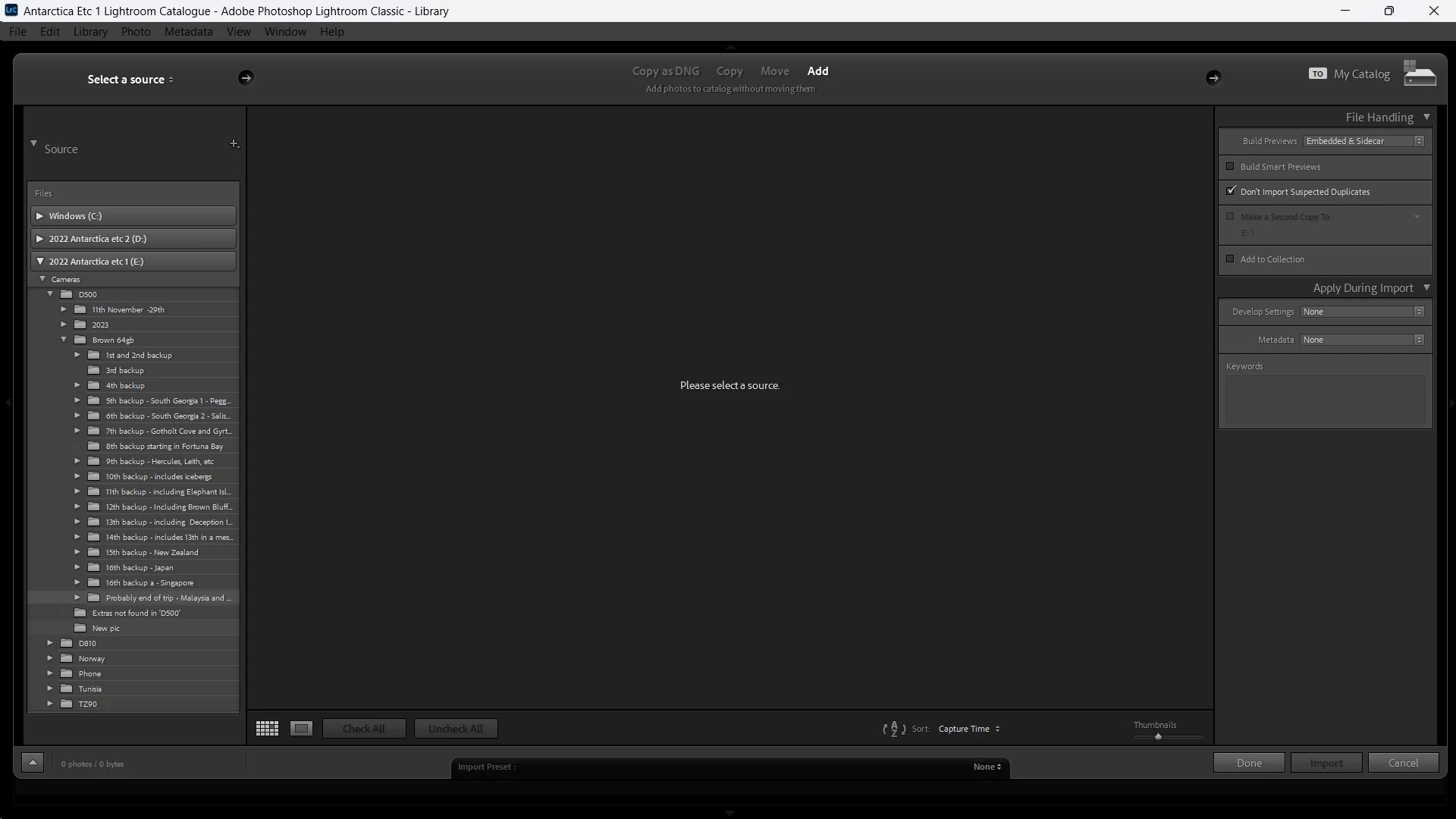 Having imported many folders of images into Lightroom via 'add' (images and catalogue on external hard drive) I can't seem to import any more. They show up in the main pain but then disappear before my eyes almost as soon as they appear - I can even see the numbers at the bottom of the screen go up, and then back down again. I've searched the internet for an answer and even tried a suggestion by a contributor to this discussion board to try 'copy' then open the 'Destination' box on the right and then revert to 'add', but nothing is showing.