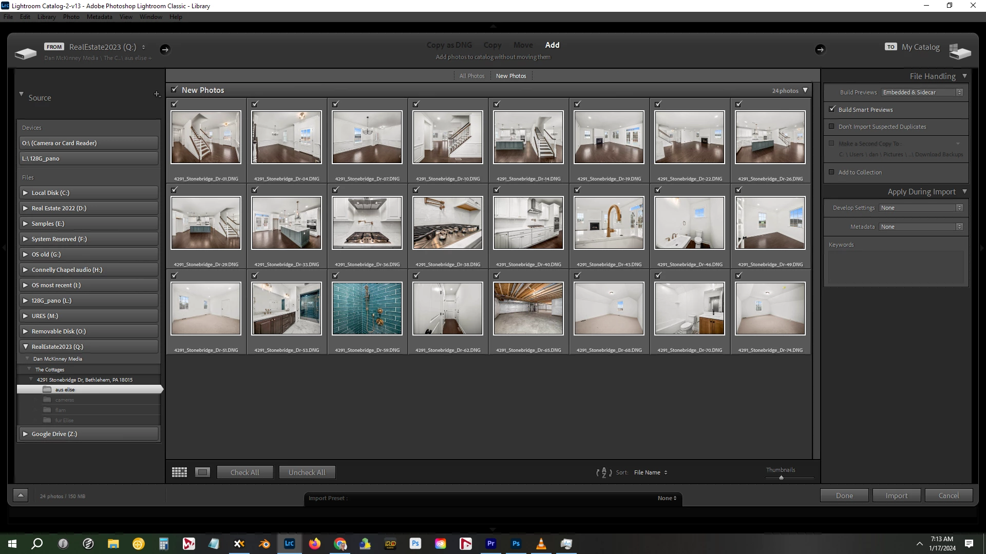 "Import at current location" shows, at the first step, all new images to be imported (see attached). In this case, they are .DNG files, and all new images are checked. But then when I import, nothing comes through. Lightroom seems to freeze on this import step, progress bar shows no progress, new photos are not imported. Eventually, I press "x" on the progress bar, and a popup says "no images were found".