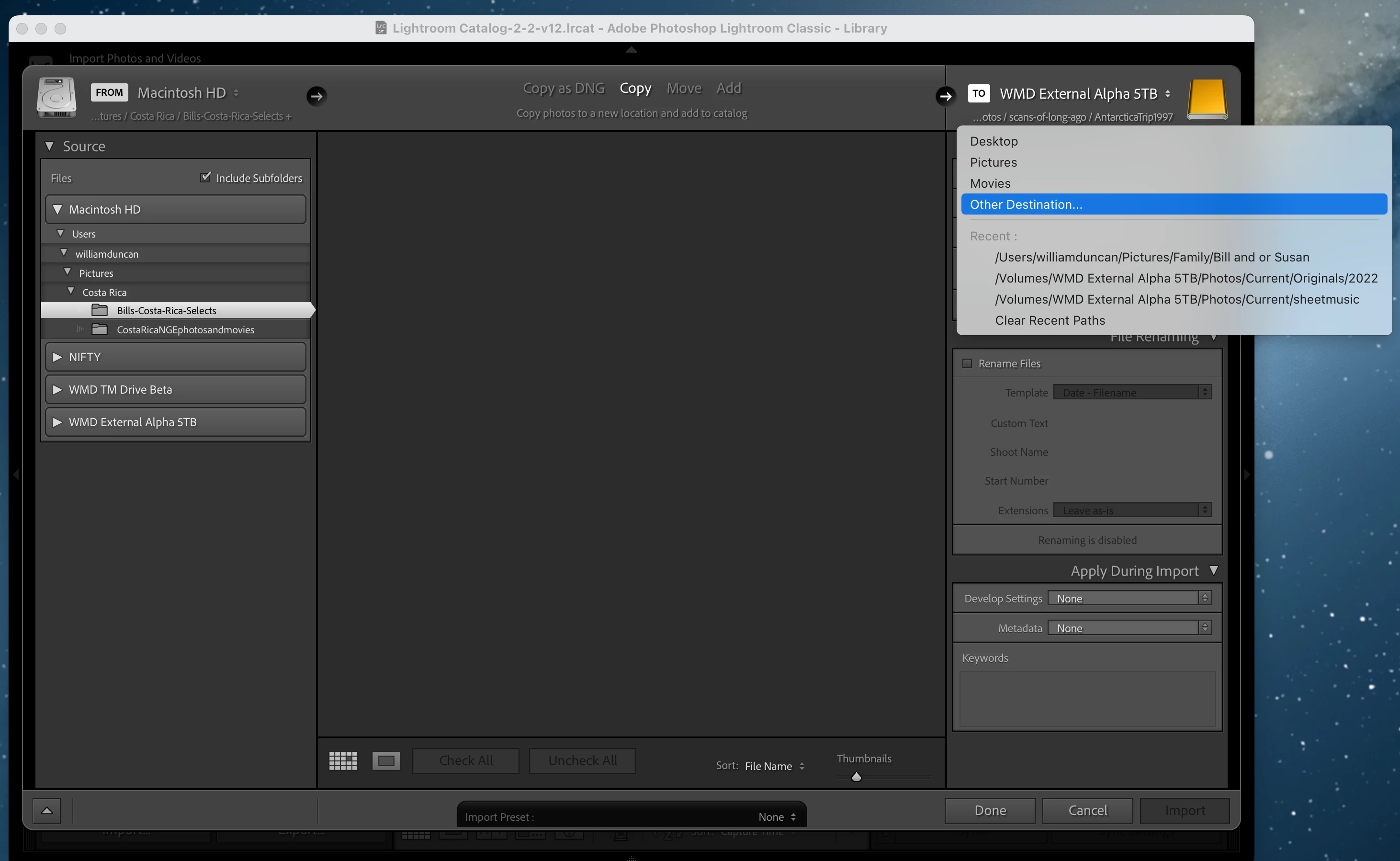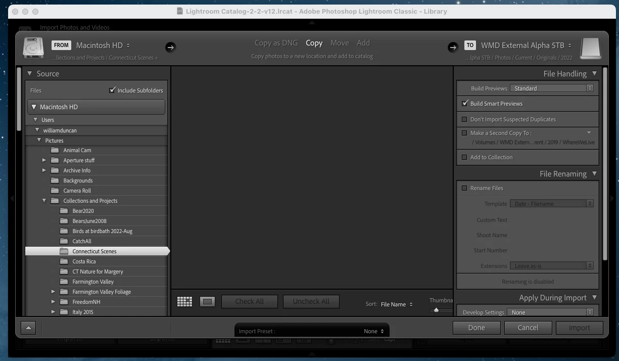 New problem crept up since yesterday (2/23/23): Upon opening the Import dialog, Lightroom Classic shows folders under Source but no files whatsoever, not on my harddrive, not on my external drives. Yes, there are image files in those folders but none appear. Intel Mac 2015, OS is Monterey 12.6.3. Checked Mac system preferences/Security & Privacy/Full Disk Access shows Adobe Lightroom Class has full disk access. I upgraded Lightroom Classic from 12.1 to 12.2 but the problem remains. Did an Uninstall then a re-install through the Creative Cloud app. Reboot computer and application. No joy. I can export to my drives, so it would seem that it is just the Import module that is broken.