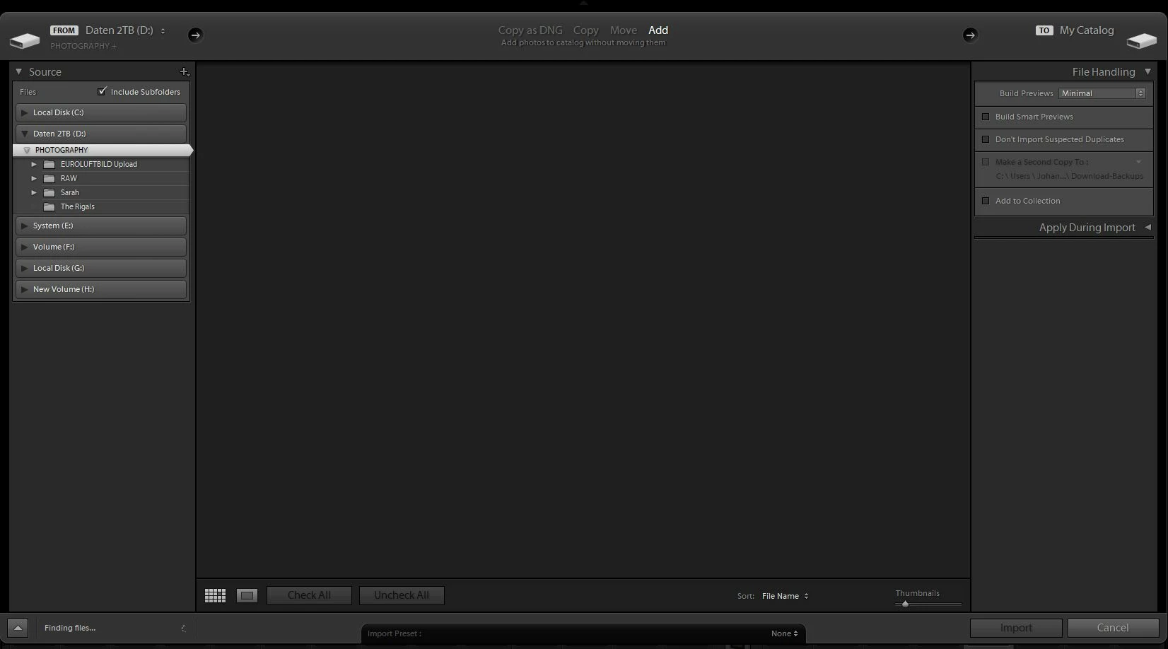 When I am trying to import photos (from any hard drive) Lightroom does not show me any images at all (see screenshot. There should be 6 images in the "photography" folder but not located in subfolders). Therefore, I cannot select images to import.