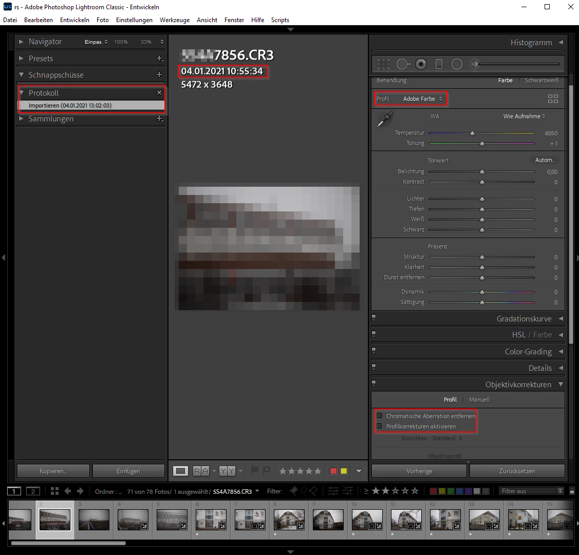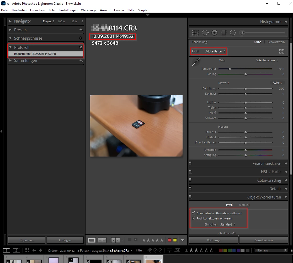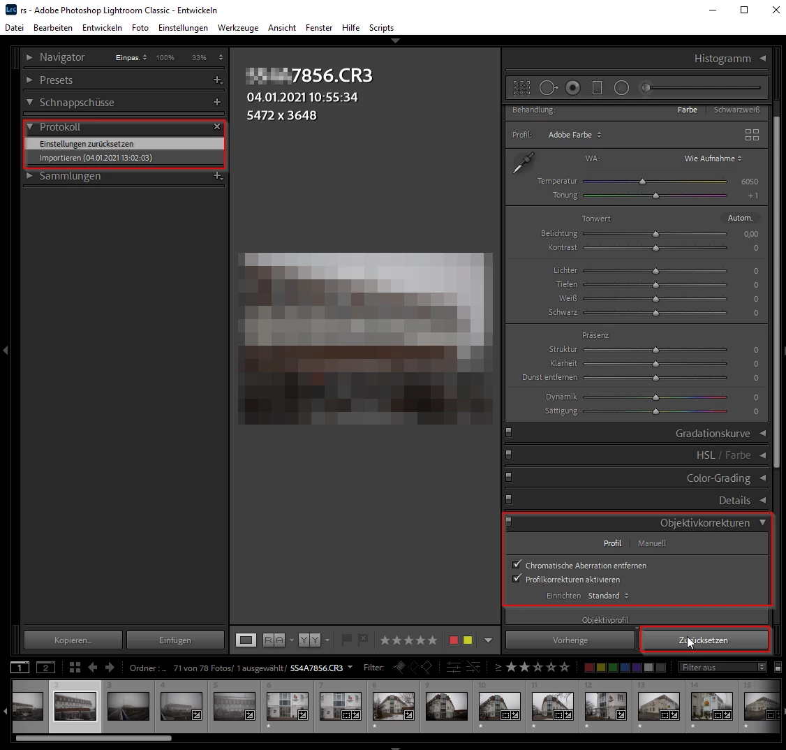 Files in the LR database imported after March 2021 always have lens corrections enabled (CA and profiles). Although this has not been set anywhere. Files that were previously in the catalogue do not have lens corrections enabled. But if you reset these "older" photos, the lens corrections are now also activated for them. Files from an EOS 1Dx, 5DII, III, IV do not do this and LR behaves as it should.