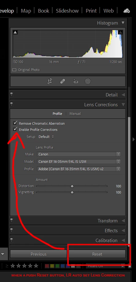 Today I encountered a very strange thing, I opened the .DNG file, and it seems that my .DNG file has "bake" the sidecar setting Lens Correction, when I press the reset button, it automatically has the Lens correction check mark like 1 preset