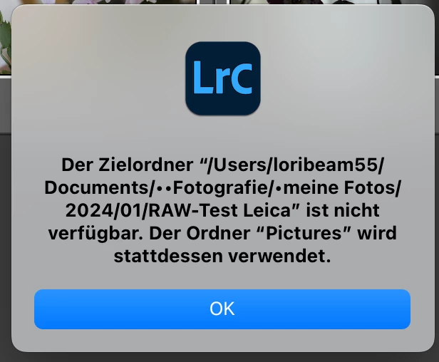 Heute erhalte ich beim Import von Bilder in Lightroom diese Fehlermeldung (siehe Anhang). Ich will die Bilder aber nicht im Ordner «Pictures» abgelegt haben, sondern ganz «normal» wie bis anhin im Ordner, den Lightroom generiert. Was ist zu tun? Danke für eure Hilfe und beste Grüsse Lori