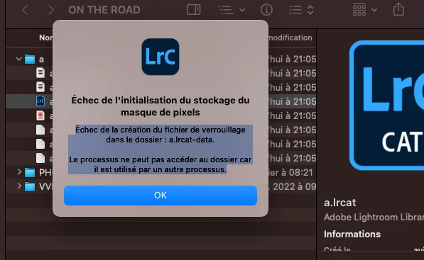 Échec de la création du fichier de verrouillage dans le dossier : a.lrcat-data.