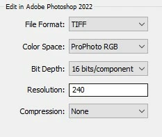 - Checked export to PS options to see if it was a colourspace issue (even though it's Mono) but sending as sRGB makes no difference to adobeRGB in this instance.