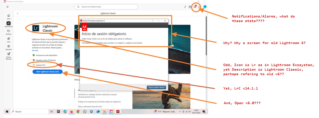 He vinculado el arranque del Lightroom Classic a la pantalla de aplicaciones de Adobe Creative Cloud sin problemas. Cada vez que lo ejecuto me aparece una pantalla pidiéndome un ID de adobe que ya está en activo en la aplicación Creative Cloud. Si sigo los pasos que indica Lightroom y vuelvo a confirmar mi ID, Lightroom no hace nada. Si vuelvo a Creative Cloud siempre dice que falta la ID. Como consecuencia obvia de este comportamiento no me deja acceder al programa para tratar mis fotografías. Adjunto una imagen donde se ve la pantalla con el Creative Cloud de fondo y autenticado en él y el mensaje que saca Lightroom por encima negando que hay una ID y por tanto el acceso.