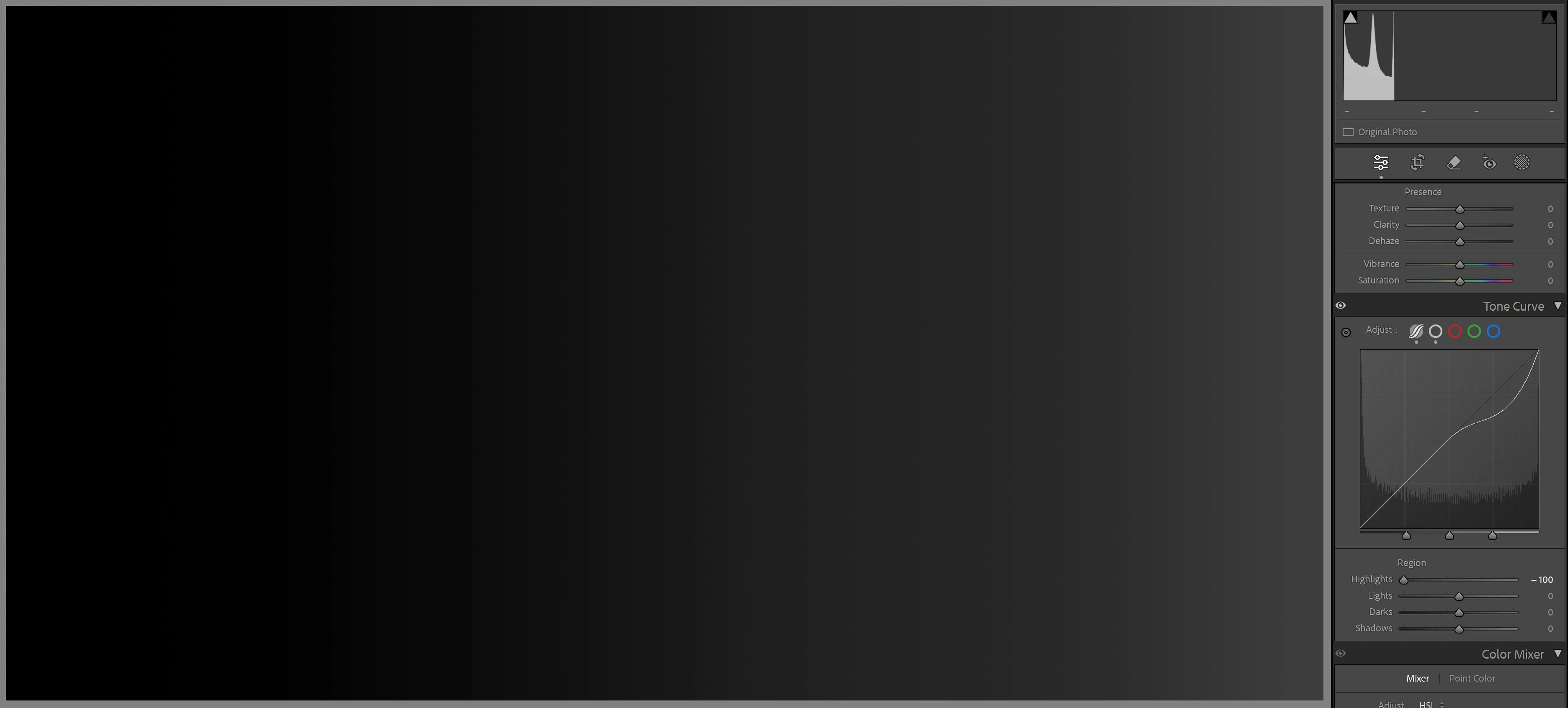 If I reset the slider and try to recreate a similar shape in all the RGB channels, I would expect the same behavior, however, for the RGB curves, the areas in the highlights are already invisible, as there are no longer highlights on the photo once it was modified by the Point Curve. Because of this, adjusting the highlight area has no effect on the image at all, it's enought to just look at the histogram if it's not immediately visible:
