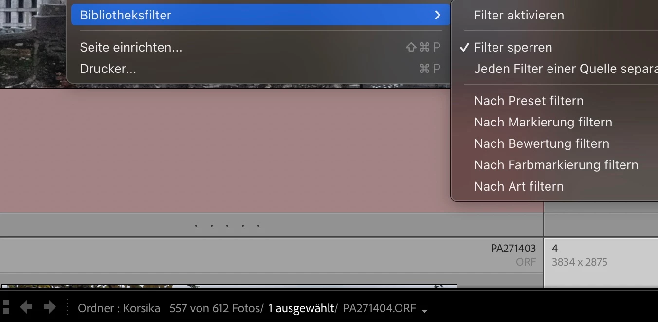 Beispiel: Ich habe über 1000 Fotos in meinem Urlaub gemacht, viele gelöscht. Laut Lightroom sind noch 612 Fotos in meinem Ordner "Korsika", es werden aber nur 557 angezeigt. Ich dachte, es sei ein Filter-Problem, aber auch, wenn ich alle Filter entferne, entweder mit Command & L oder über das Menu (s. Screenshot), werden nach wie vor nur 557 Fotos angezeigt.