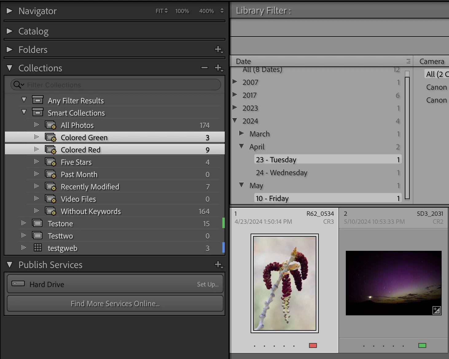 I have a number of smart collections I've created to process my family pictures every month. The smart collections work great, but, my issue is the date range. Let's say I have 15 smart collections to do my processing. That means I need to update all 15 smart collections to set the date range for the month I want. This solution is OK, but, it would be much better if smart collections could be "nested" or "connected" somehow so that that the search criteria of different smart collections can be combined. That way I would be able to change the date range in just a single smart collection. It may look something like this: