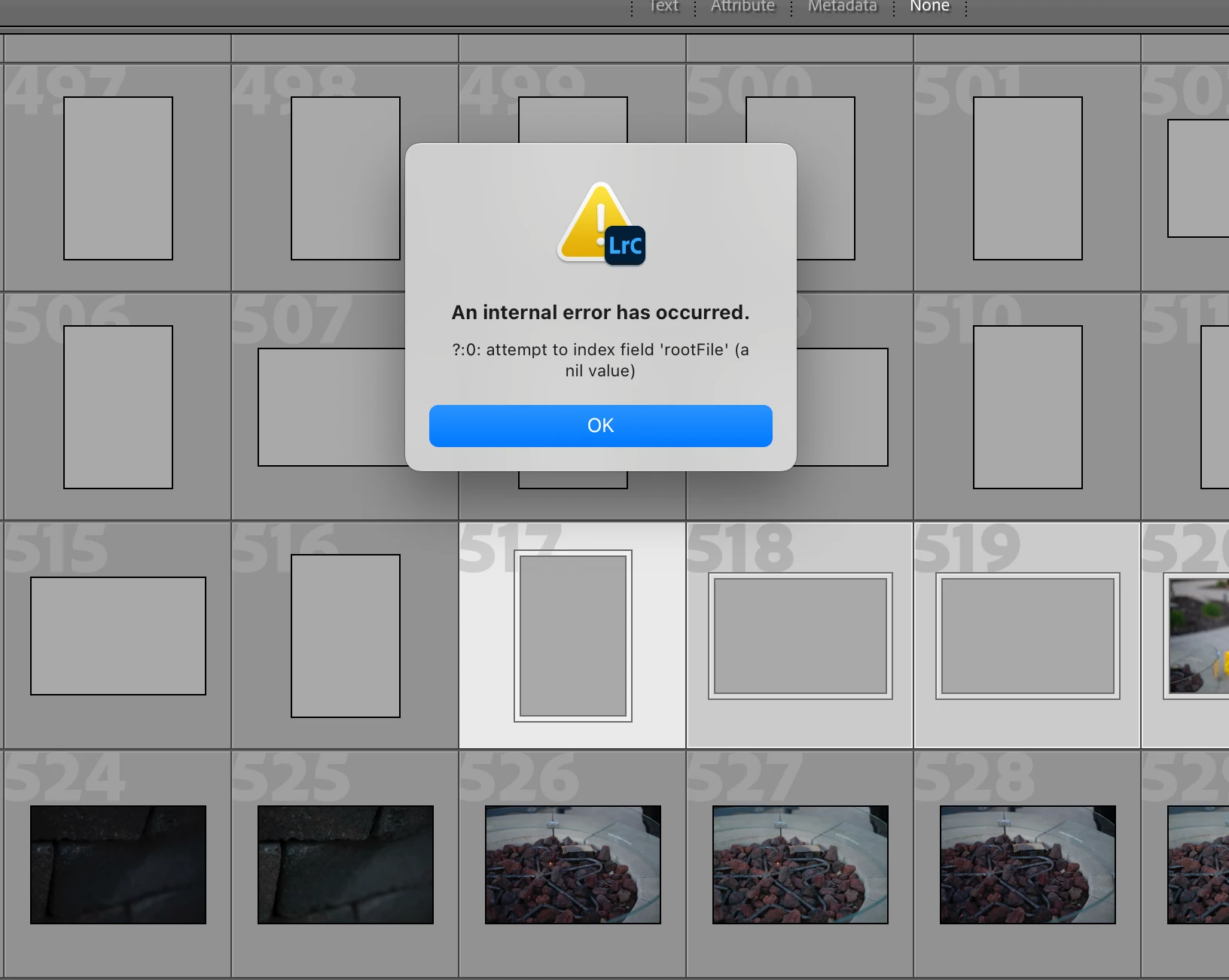 In the last few photo imports to my Lightroom catalog, I've noticed that every few photos, a grayed-out file appears in the grid view. These files don’t correspond to any actual images—they don’t show up in Finder, and they aren’t recognized as missing by Lightroom. It's as if Lightroom is generating placeholder files with no data.