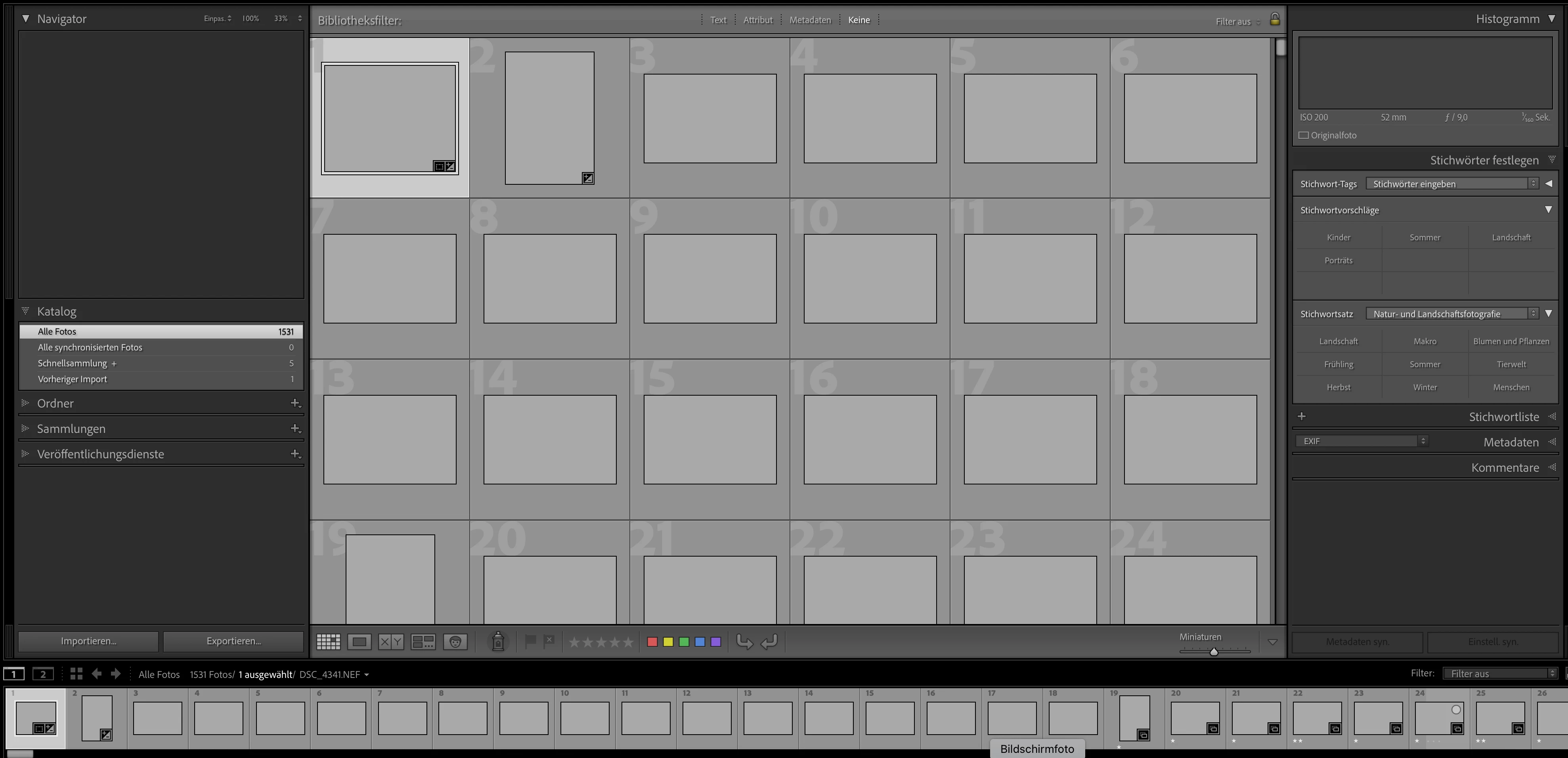 Zunächst aktualisierte ich den Privatkatalog, jetzt möchte ich den dienstlichen aktualisieren. Das ging eigentlich auch. Es sind alle Bilder mit den Metadaten usw. vorhanden, ABER ich kann sie nicht sehen und mit ihnen nicht arbeiten. Ich habe bereits div. Aktualisierungen auch von backups durchgeführt, aber es funktioniert nicht.