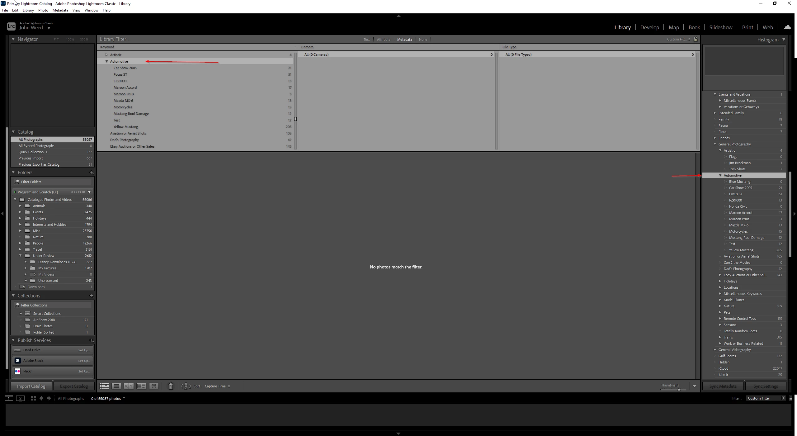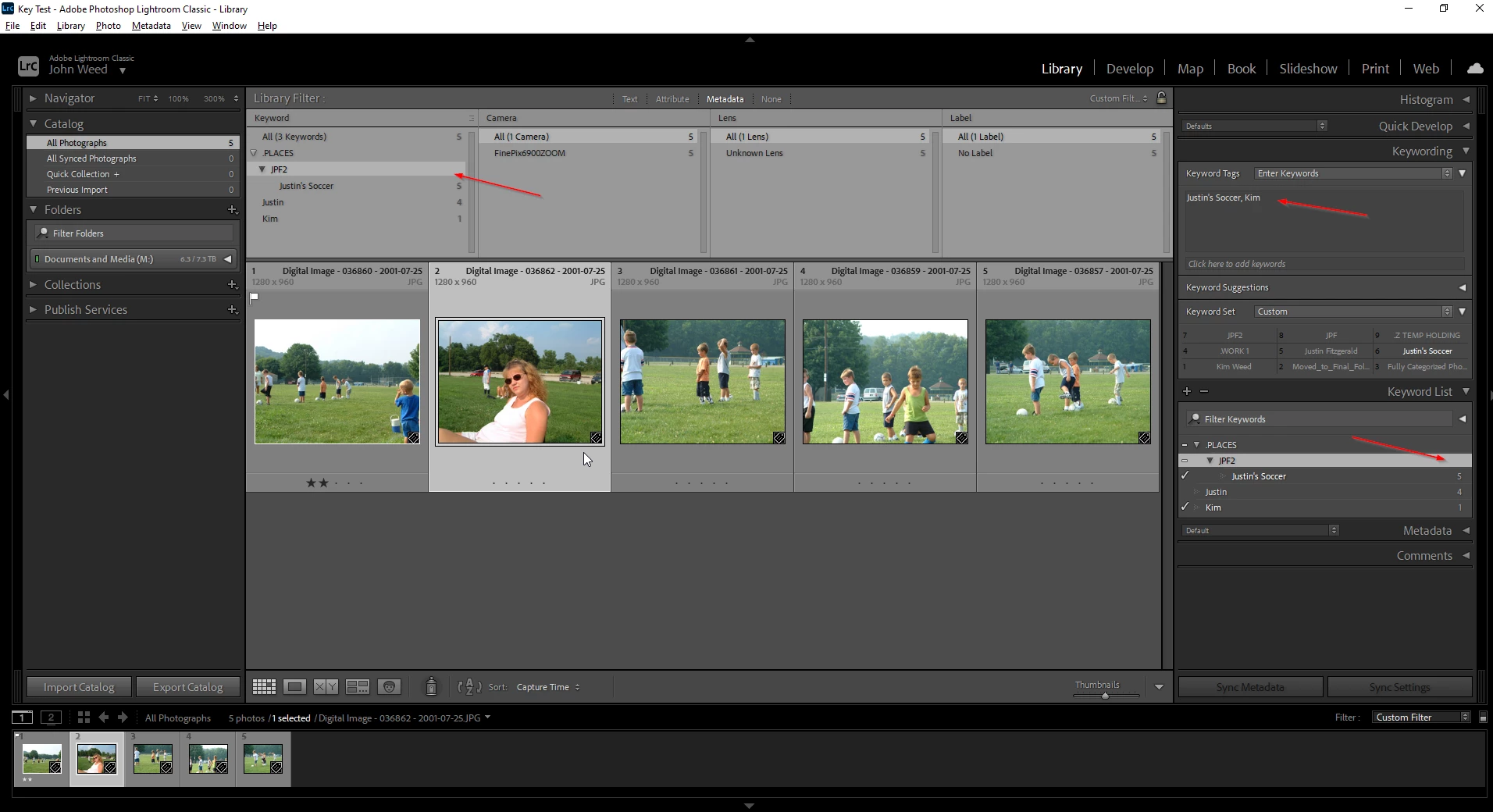I have 5 photos from my kids soccer practice. I have keyworded the files using a nested hierarchy of keywords ".PLACES>JPF2>Justin's Soccer" You can see as an example, the selected photo only has 2 keywords on it, "Justin's Soccer" and "Kim". I have used the filtering option to select "JPF2", which should not reveal any photos, because no photo actually has that keyword set to it. Why am I seeing any photos in the filtered view. They should all be hidden at this time. I have noticed this error only has happened recently and only for new nested keyword groups I am creating. For my old keyword groups in my calatlog, this behavior works as it should. This issues is really making it hard to clean up my photo collections because the wrong photos are alsways being shown.
