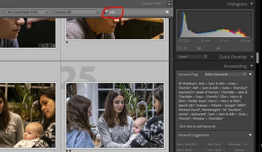 2. The string "r4k" is contained in a keyword synonym. The only way to check that is to do Metadata > Export Keywords, open the exported text file in Notepad, and search for "r4k".